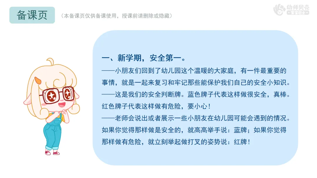 ——老师会说出或者展示一些小朋友在幼儿园可能会遇到的情况。如果你觉得那样做是安全的,就高高举手说:蓝牌;如果你觉得那样做有危险,就立刻举起做打叉的姿势说:红牌!
