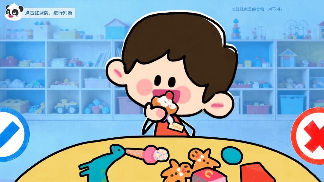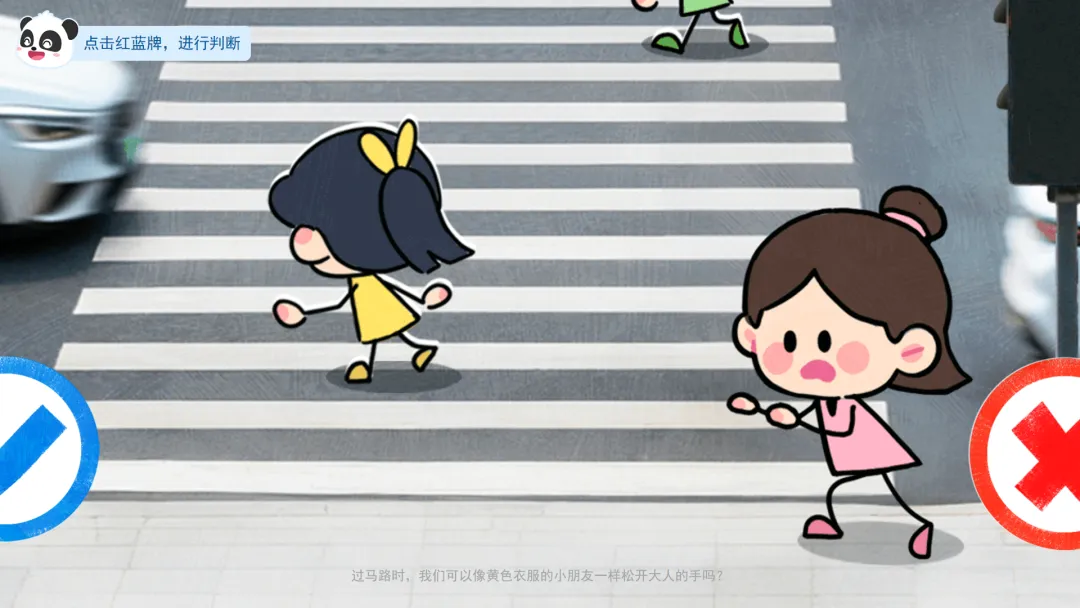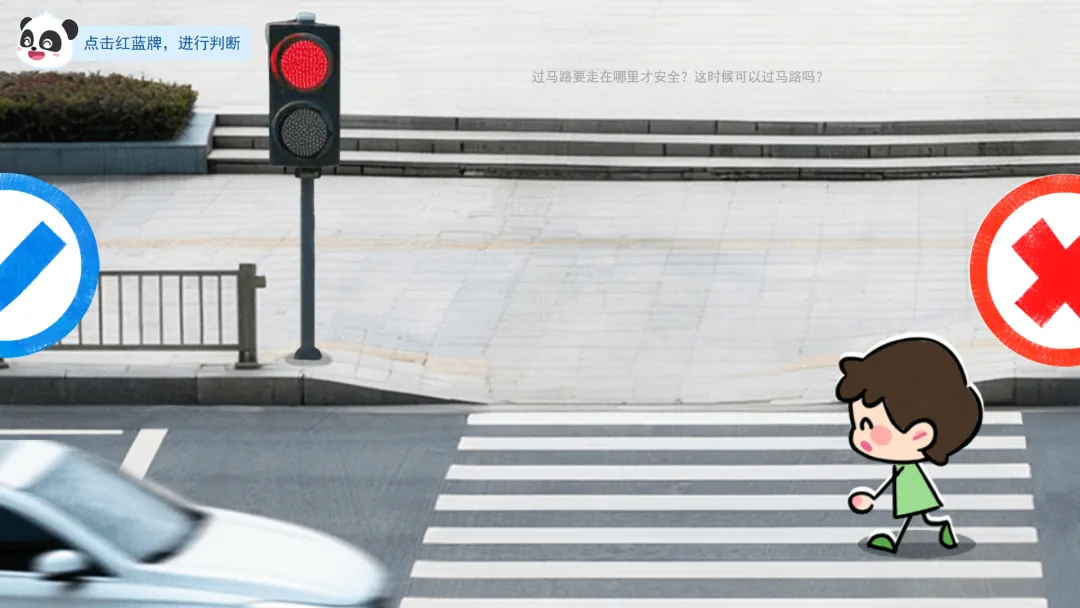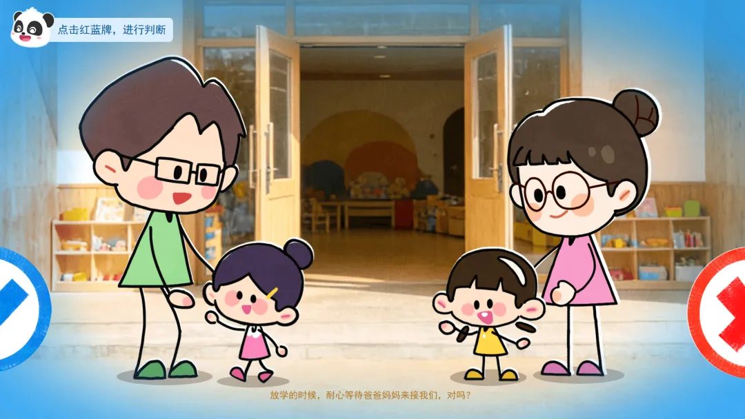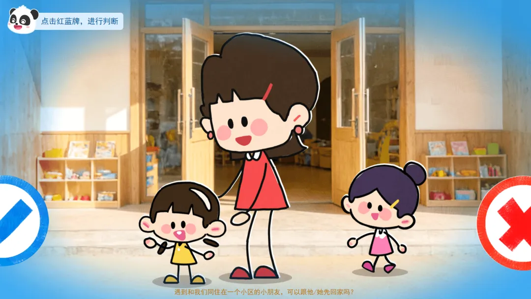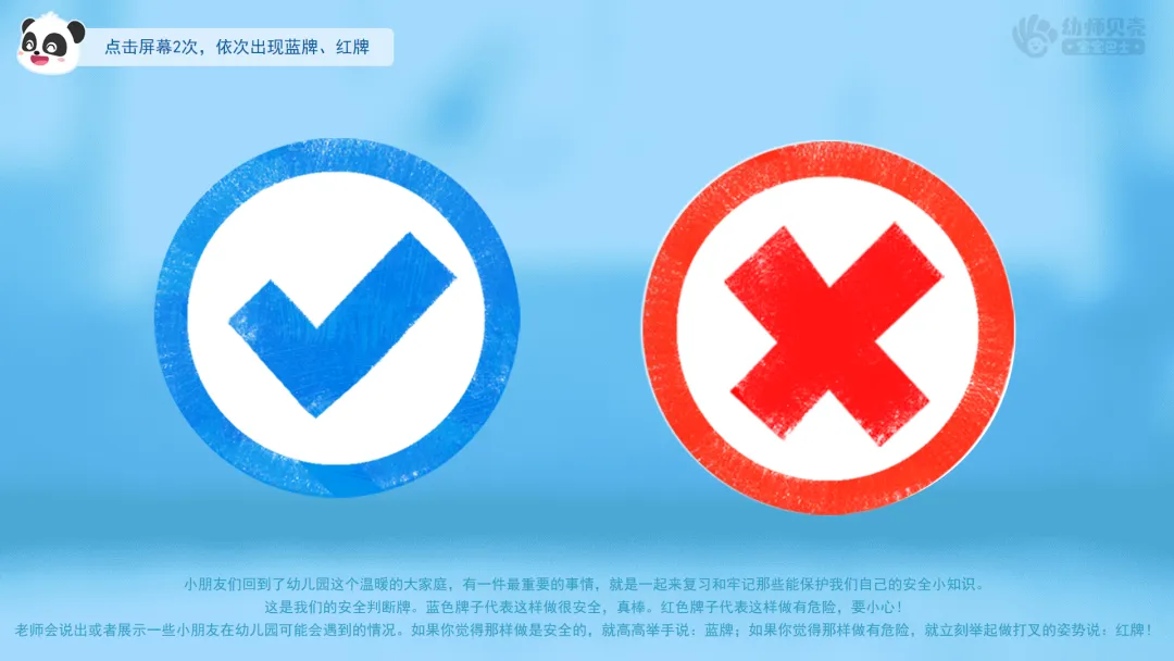 ——这是我们的安全判断牌。蓝色牌子代表这样做很安全,真棒。红色牌子代表这样做有危险,要小心!
