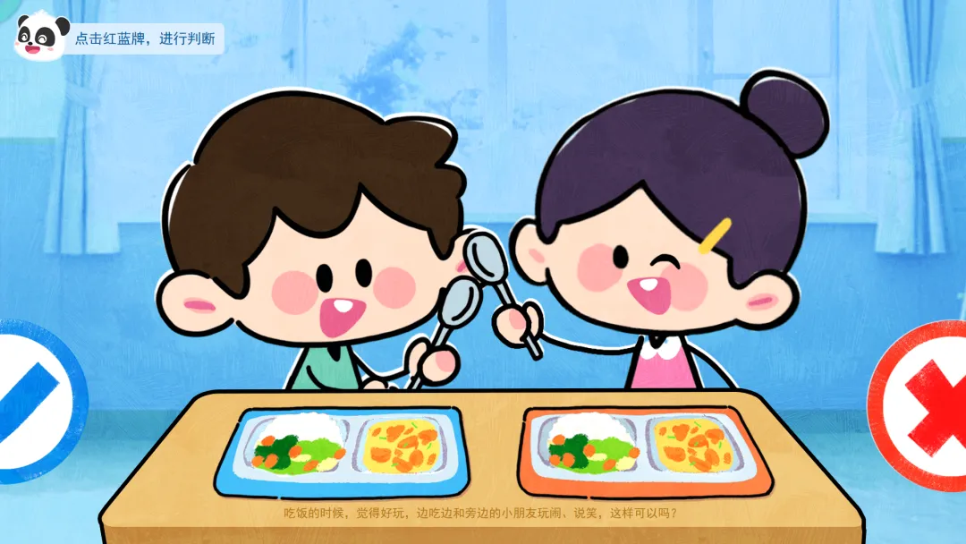 ——吃饭的时候,觉得好玩,边吃边和旁边的小朋友玩闹、说笑,这样可以吗?