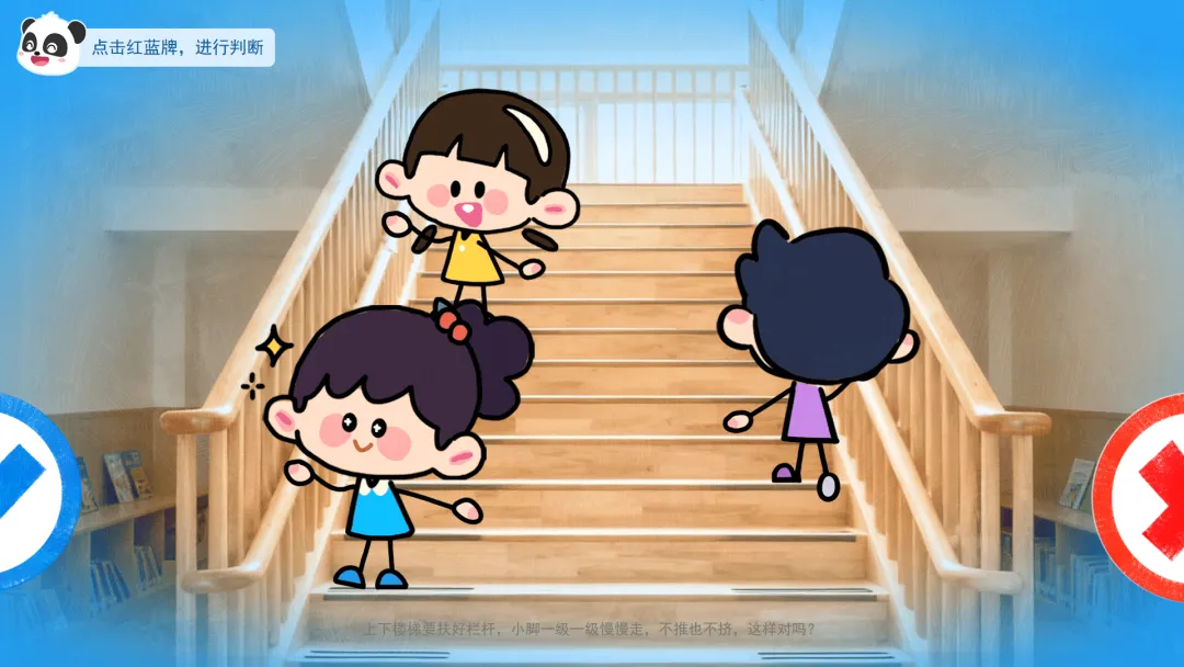 ——上下楼梯要扶好栏杆,小脚一级一级慢慢走,不推也不挤,这样对吗?