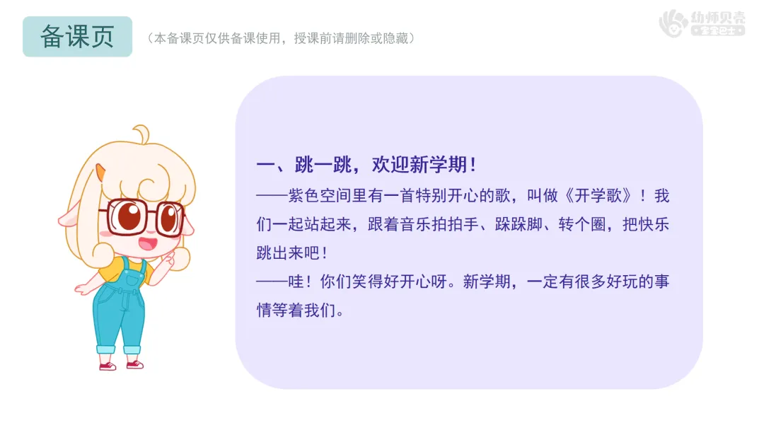 l活动过程: 一、跳一跳,欢迎新学期!——紫色空间里有一首特别开心的歌,叫做《开学歌》!我们一起站起来,跟着音乐拍拍手、跺跺脚、转个圈,把快乐跳出来吧!