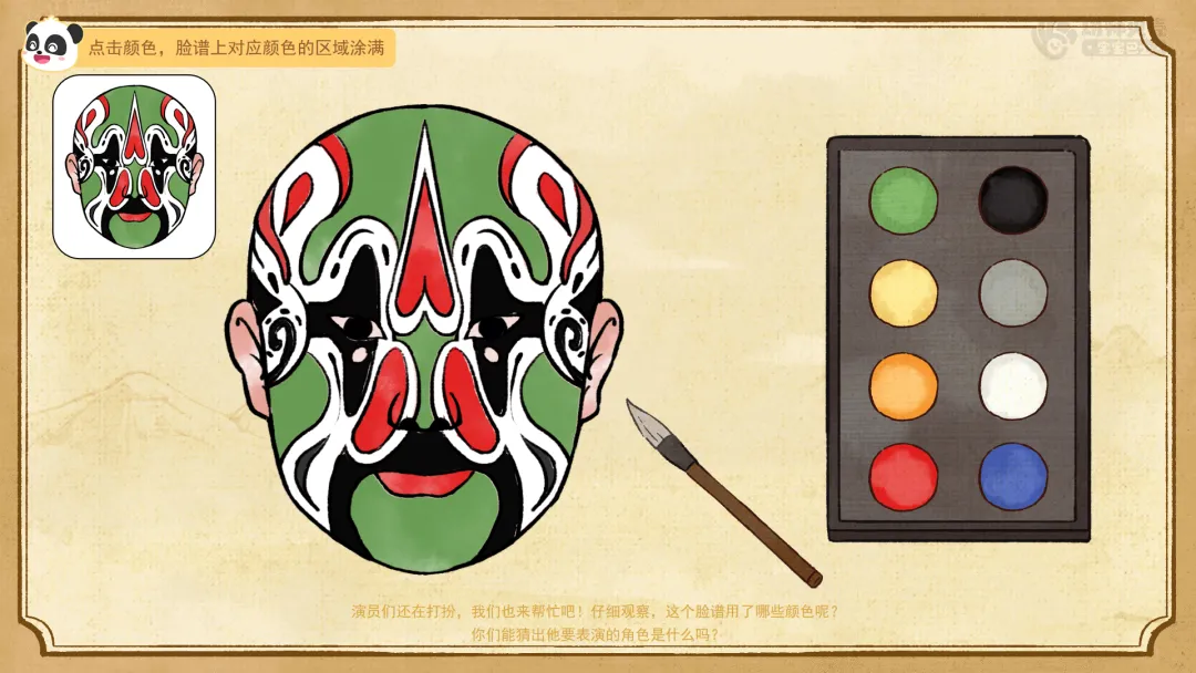 ——演员们还在打扮,我们也来帮忙吧!仔细观察,这个脸谱用了哪些颜色呢?