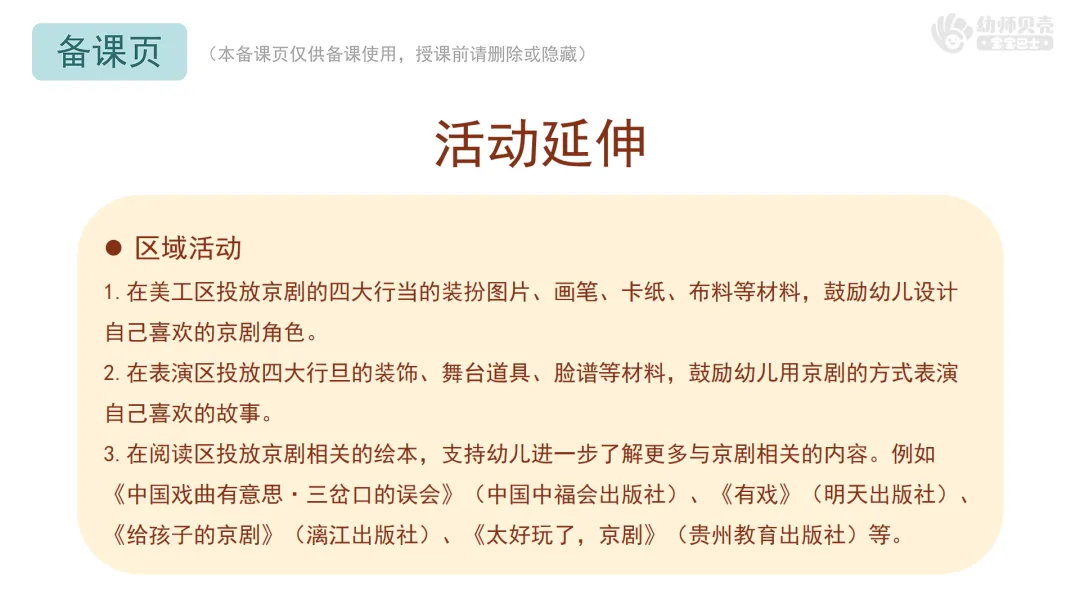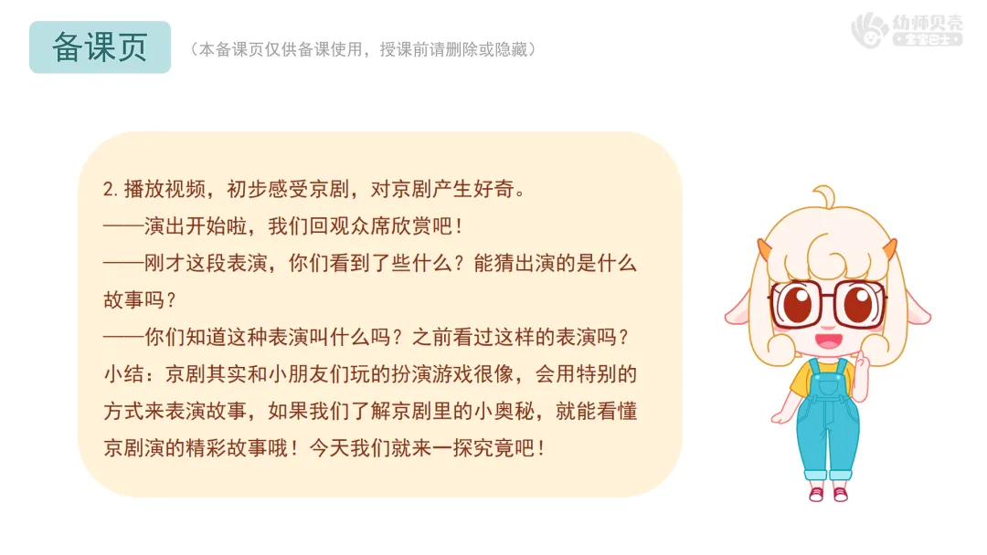 小结:京剧其实和小朋友们玩的扮演游戏很像,会用特别的方式来表演故事,如果我们了解京剧里的小奥秘,就能看懂京剧演的精彩故事哦!今天我们就来一探究竟吧!
