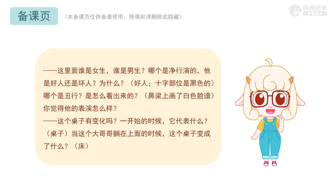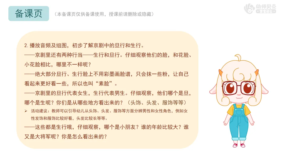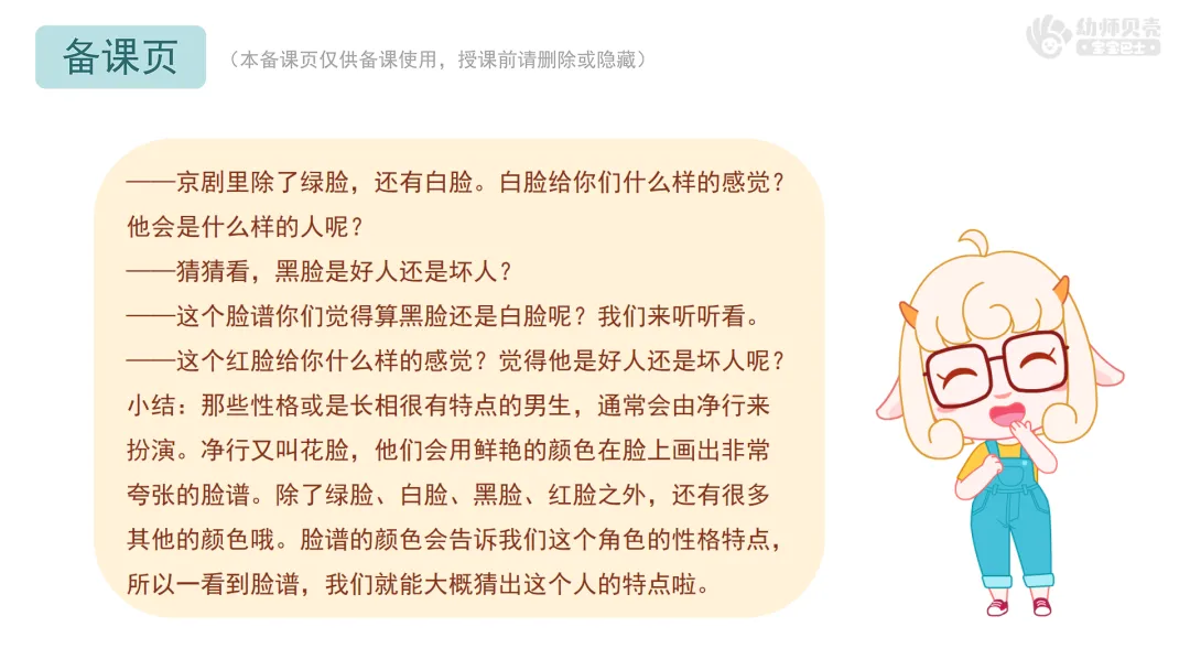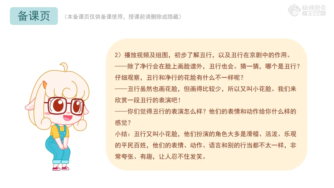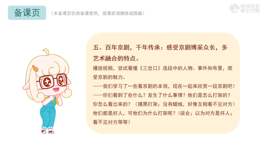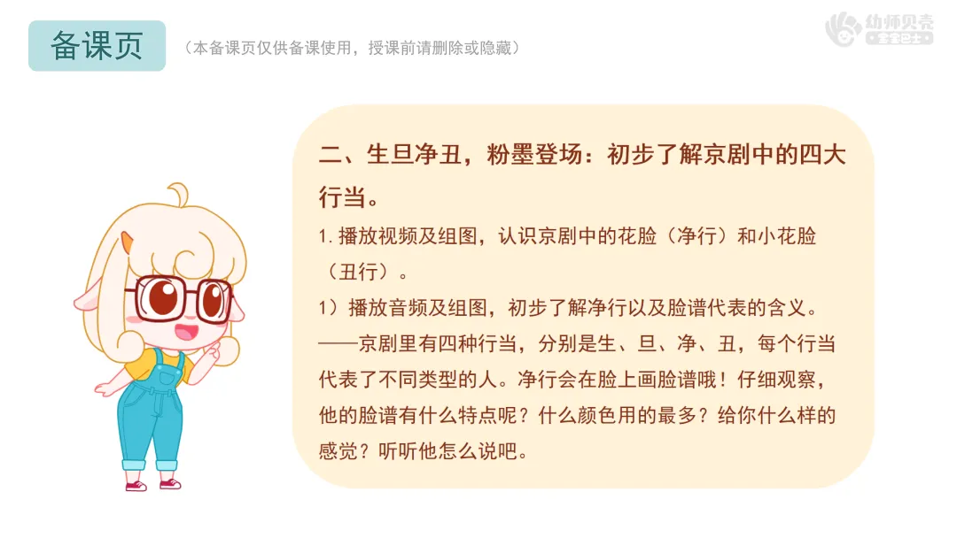l重点:感受京剧魅力,初步了解京剧四大行当、角色动作的含义以及一桌二椅代表的场景。