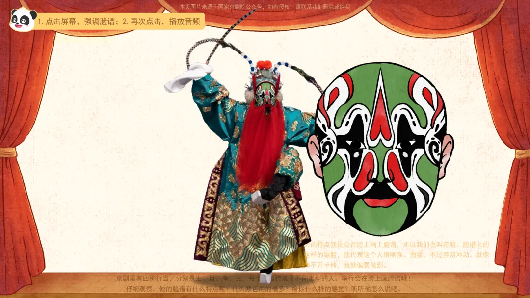 ——京剧里有四种行当,分别是生、旦、净、丑,每个行当代表了不同类型的人。净行会在脸上画脸谱哦!仔细观察,他的脸谱有什么特点呢?什么颜色用的最多?给你什么样的感觉?听听他怎么说吧。