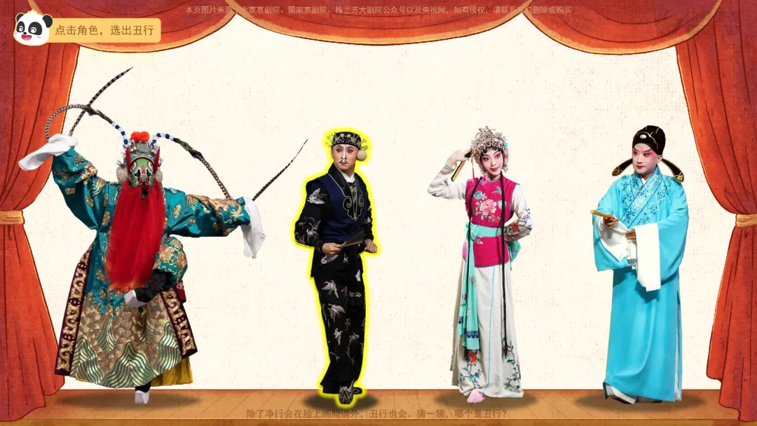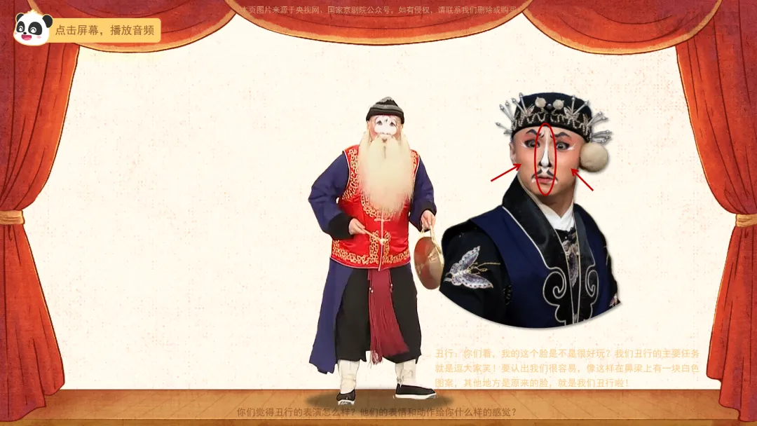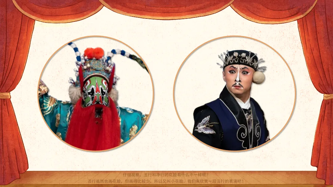 ——除了净行会在脸上画脸谱外,丑行也会。猜一猜,哪个是丑行?仔细观察,丑行和净行的花脸有什么不一样呢?