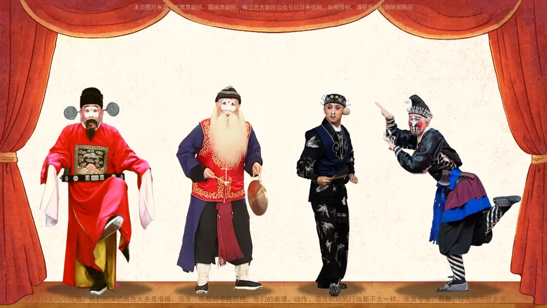 ——丑行虽然也画花脸,但画得比较少,所以又叫小花脸。我们来欣赏一段丑行的表演吧!