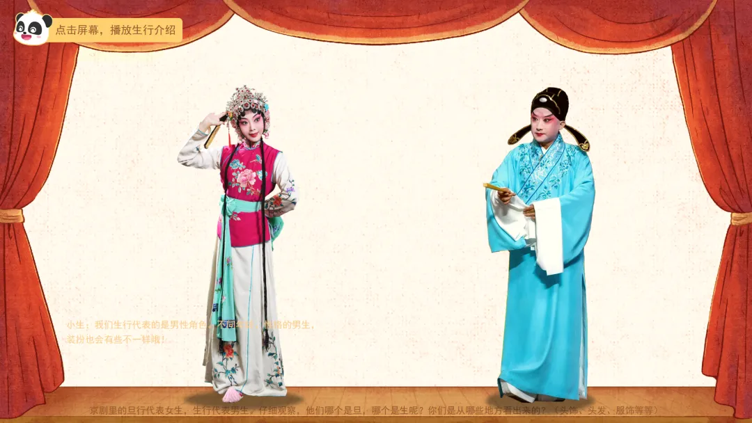 ——京剧里的旦行代表女生,生行代表男生。仔细观察,他们哪个是旦,哪个是生呢?你们是从哪些地方看出来的?(头饰、头发、服饰等等)