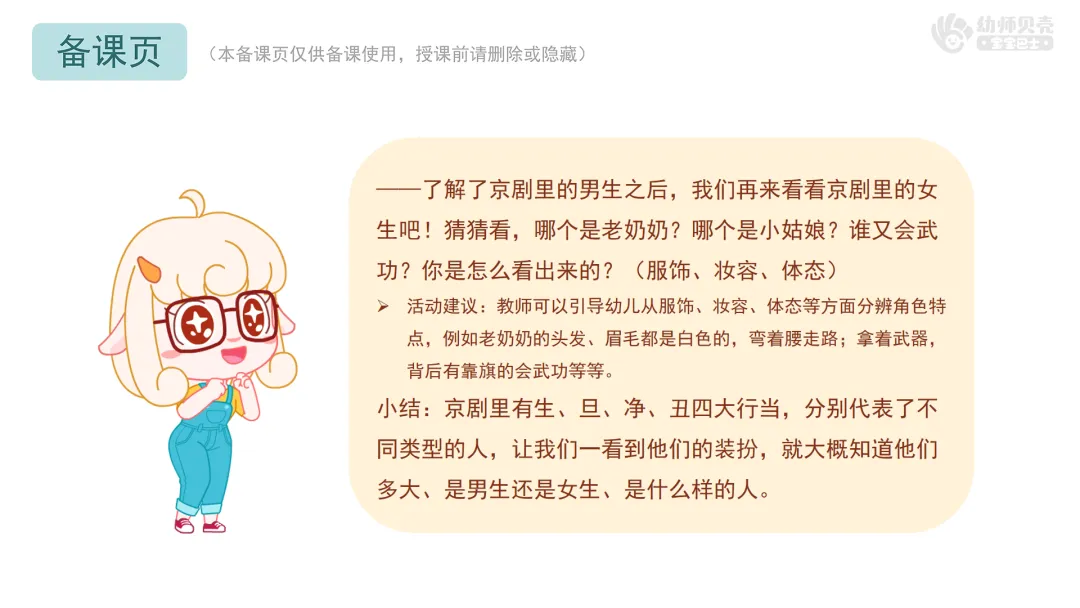 Ø活动建议:教师可以引导幼儿从头饰、头发、服饰等方面分辨男性和女性角色,例如女性发饰和服饰比较好看,头发比较长等等。