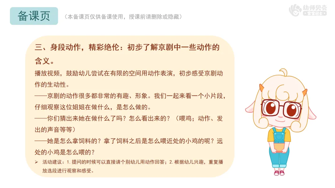 Ø活动建议:1.提问的时候可以直接请个别幼儿用动作回答;2.根据幼儿兴趣,重复播放选段进行观察和感受。