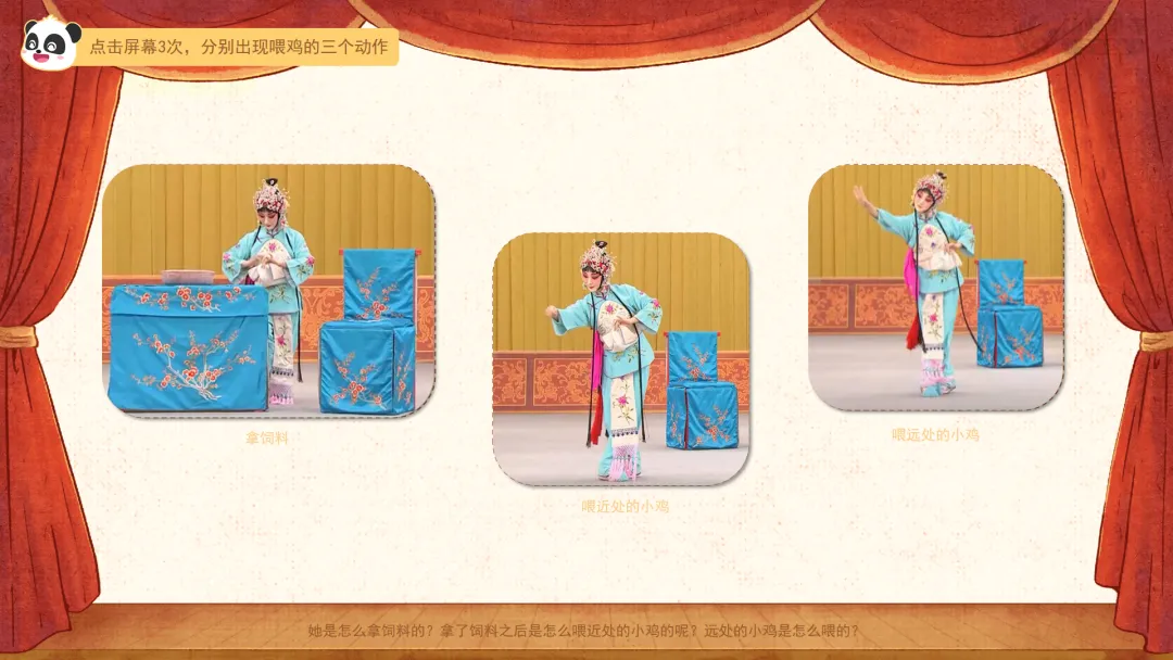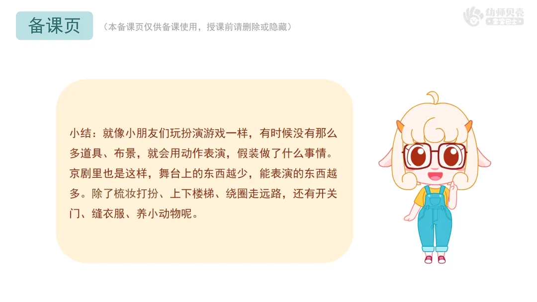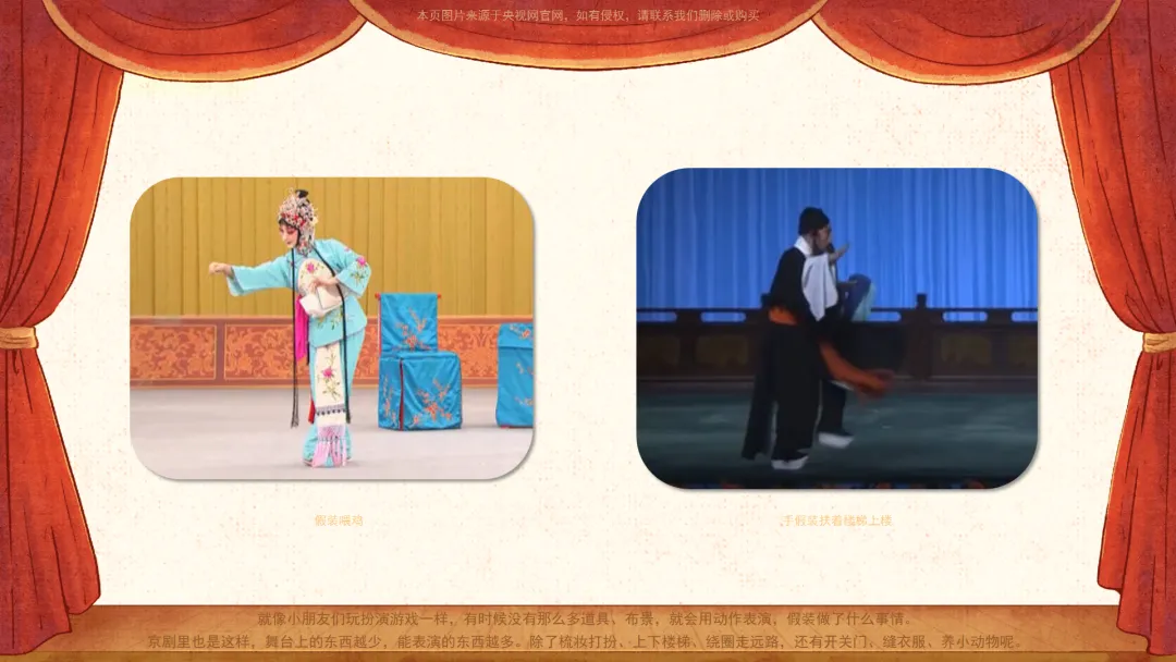 小结:就像小朋友们玩扮演游戏一样,有时候没有那么多道具、布景,就会用动作表演,假装做了什么事情,京剧里也是这样,舞台上的东西越少,能表演的东西越多。除了梳妆打扮、上下楼梯、绕圈走远路,还有开关门、缝衣服、养小动物呢。