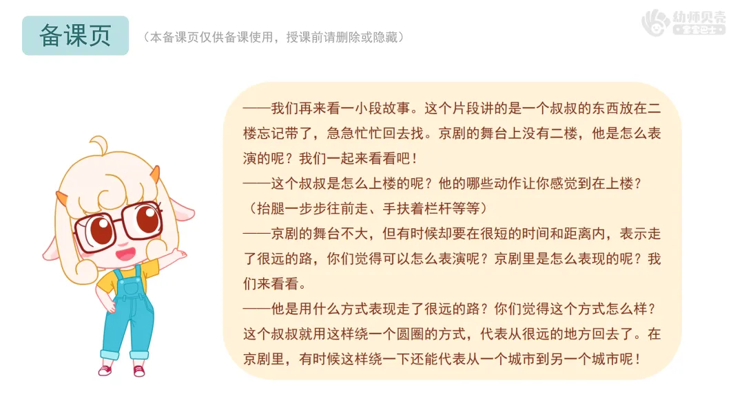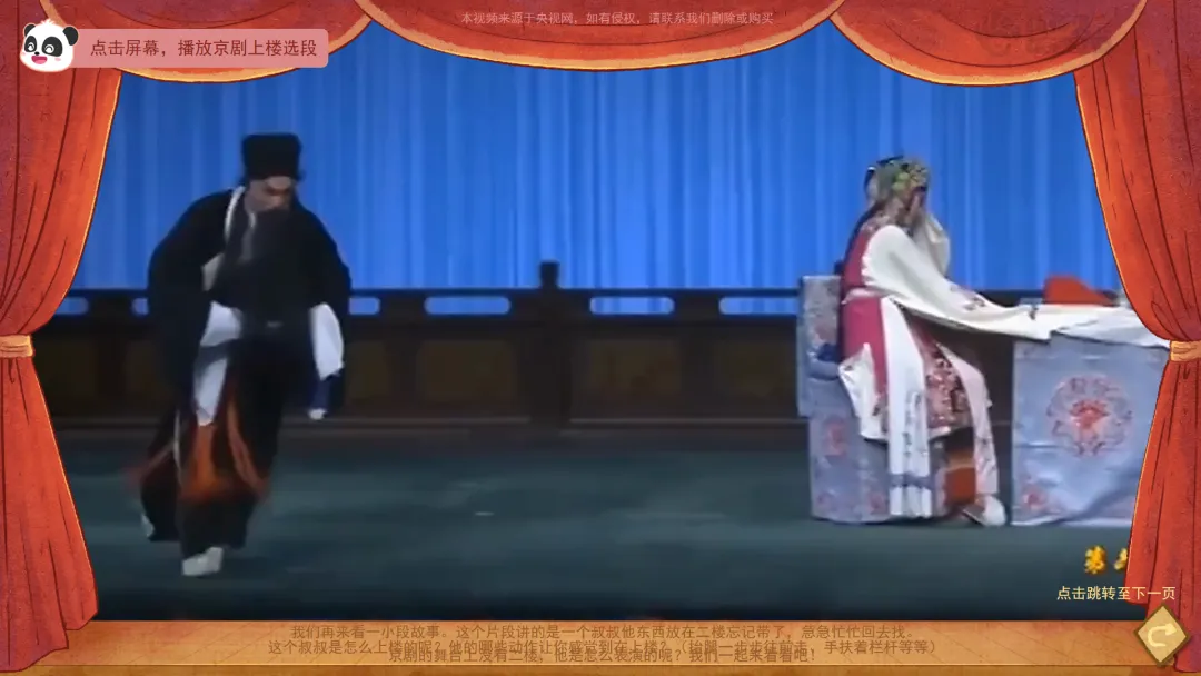 ——我们再来看一小段故事。这个片段讲的是一个叔叔他东西放在二楼忘记带了,急急忙忙回去找。京剧的舞台上没有二楼,他是怎么表演的呢?我们一起来看看吧!