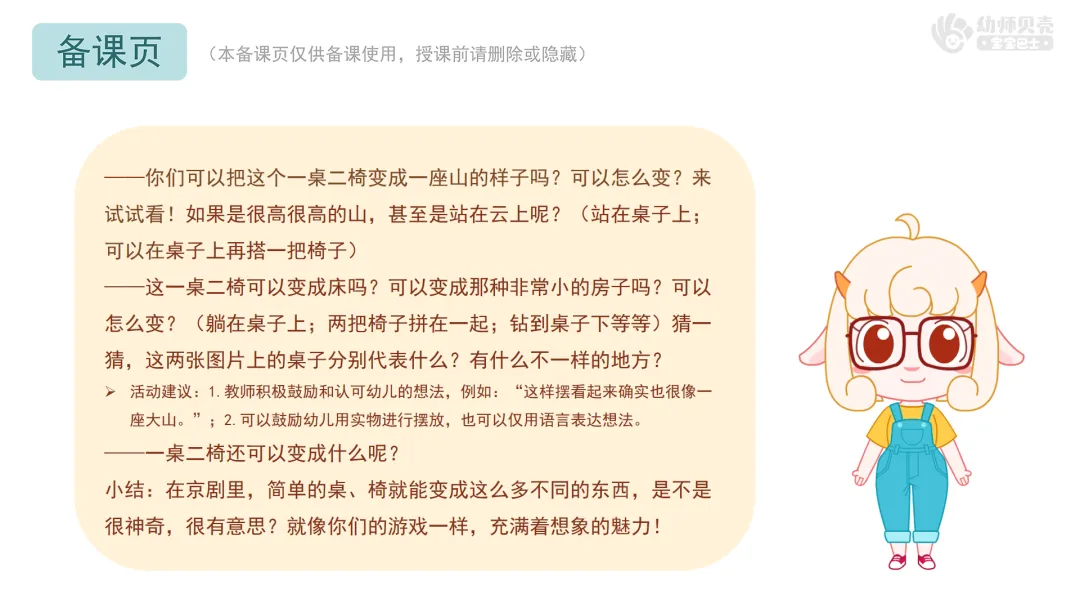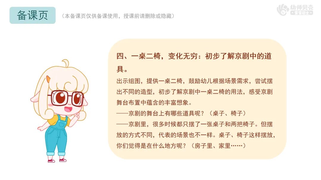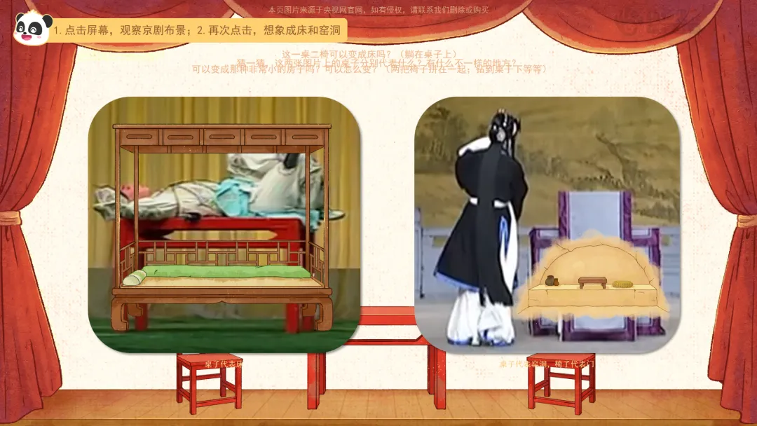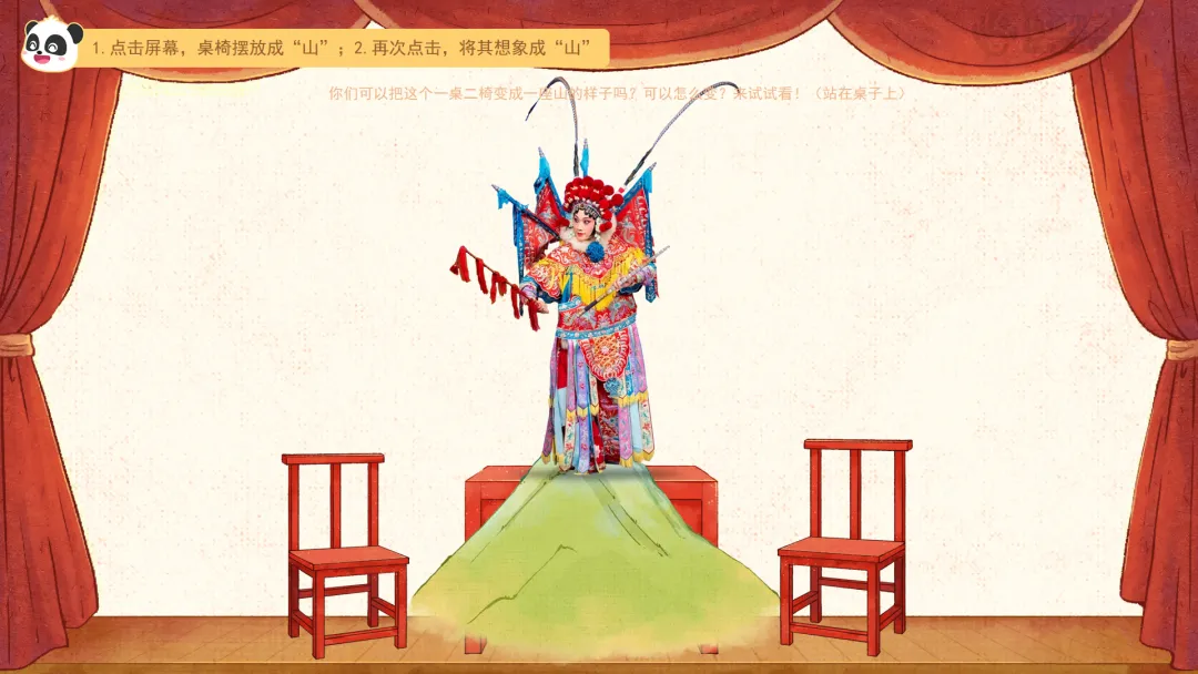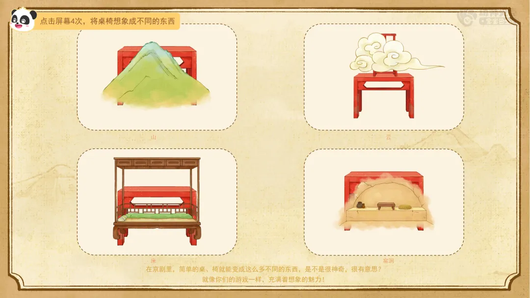 小结:在京剧里,简单的桌、椅就能变成这么多不同的东西,是不是很神奇,很有意思?就像你们的游戏一样,充满着想象的魅力!