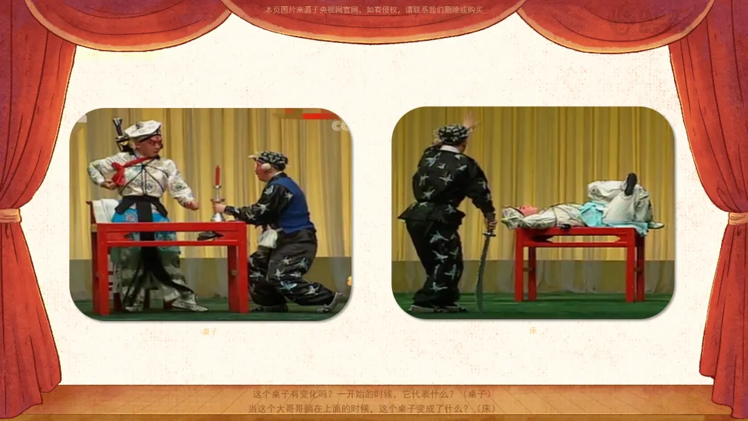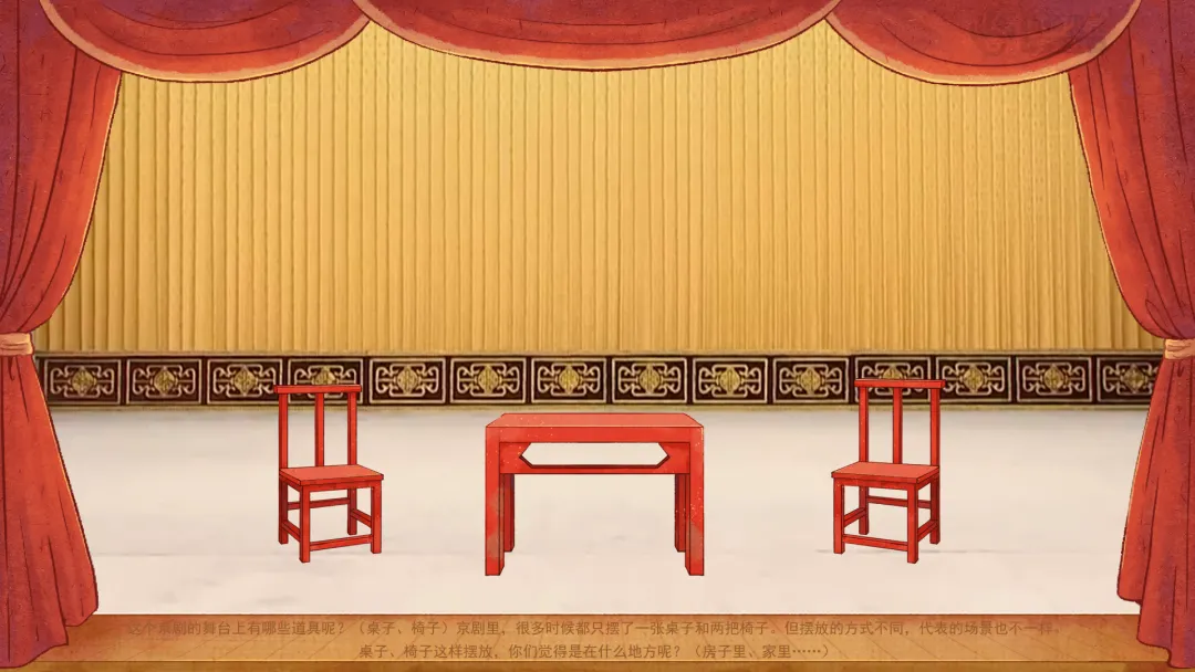——这个京剧的舞台上有哪些道具呢?(桌子、椅子)