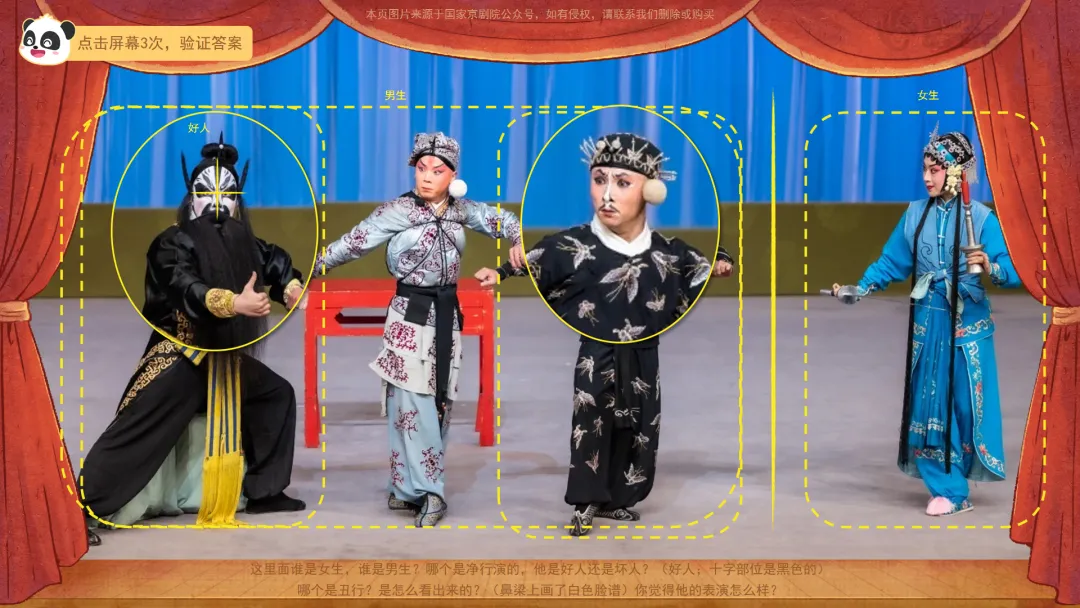 ——这里面谁是女生,谁是男生?哪个是净行演的,他是好人还是坏人?为什么?(好人;十字部位是黑色的)哪个是丑行?是怎么看出来的?(鼻梁上画了白色脸谱)你觉得他的表演怎么样?