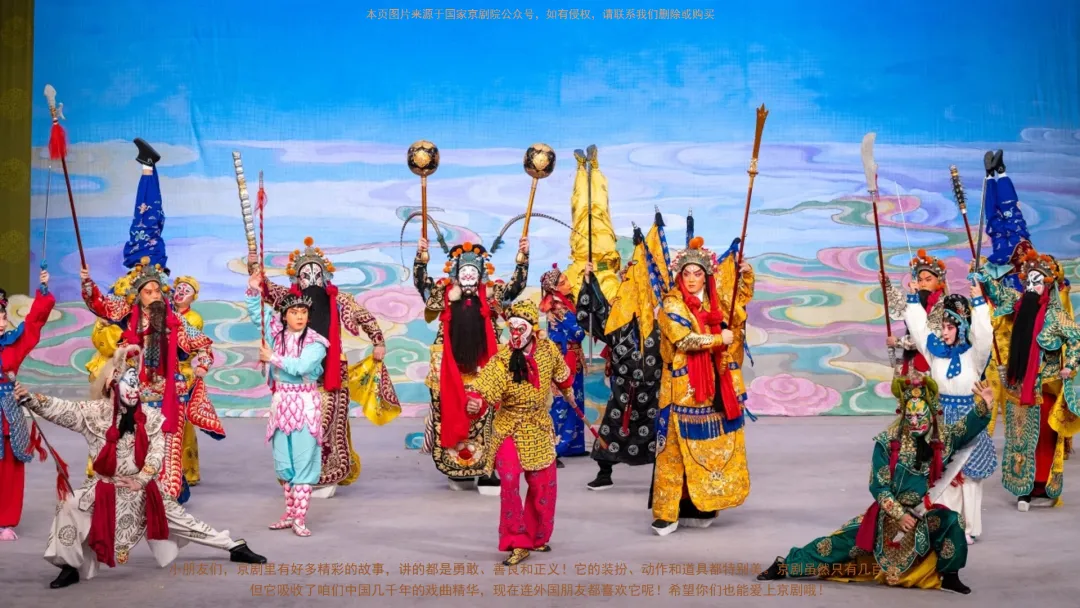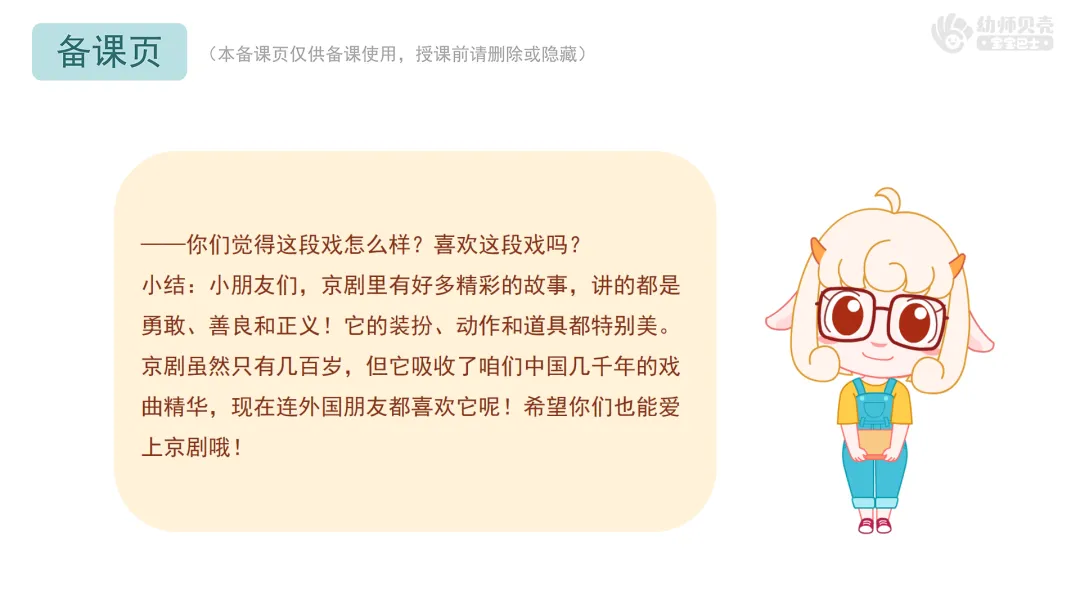 小结:小朋友们,京剧里有好多精彩的故事,讲的都是勇敢、善良和正义!它的装扮、动作和道具都特别美。京剧虽然只有几百岁,但它吸收了咱们中国几千年的戏曲精华,现在连外国朋友都喜欢它呢!希望你们也能爱上京剧哦!