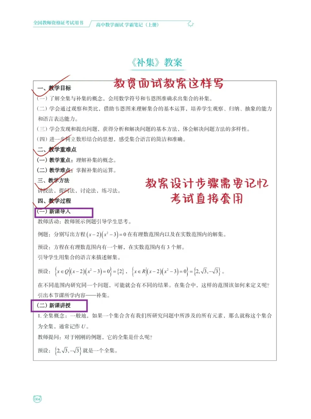 各学科的试讲学霸笔记以题本+教案+逐字稿+答辩的形式,完全还原考场,包含72道高频试讲题目,每个试讲都是以题本+教案+逐字稿+答辩的形式进行全方位解析,同时根据不同课型总结了分类模板。