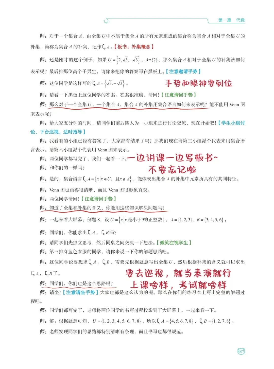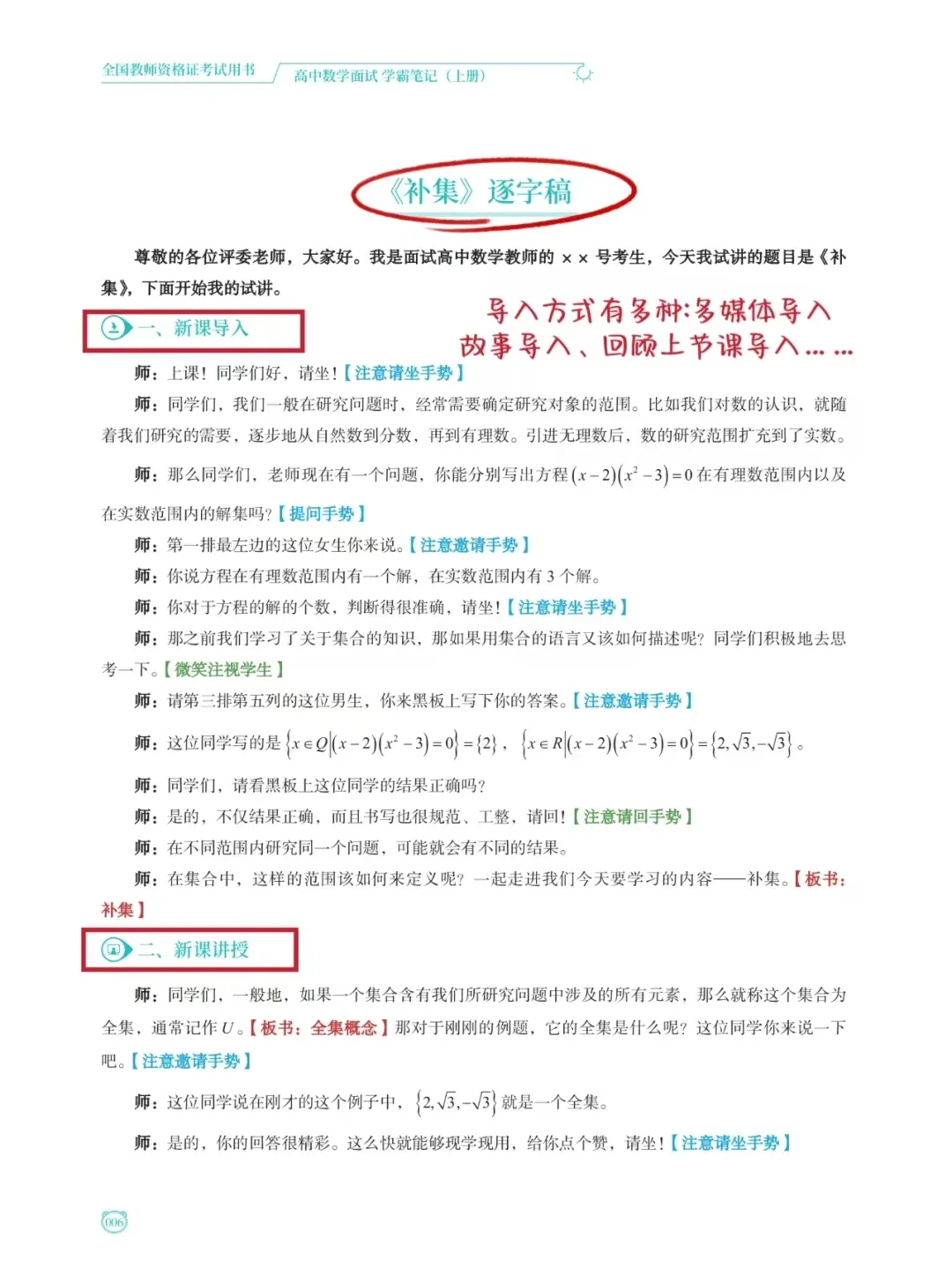 逐字稿即台词本,逐字逐句教你怎样试讲,还用彩色表明讲课时的语气、表情、动作等,红色是板书,蓝色是手势,绿色是眼神交流、巡视等。