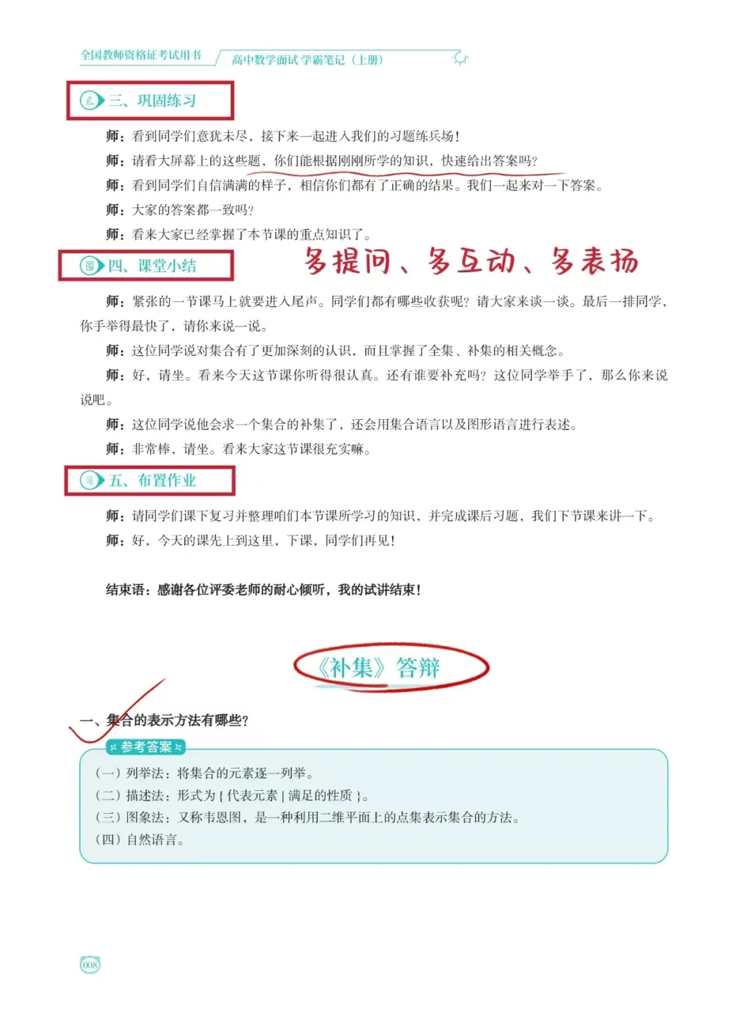 答辩:试讲结束,考官高频或可能问到2个问题,笔记里有详细的回答参考答案。