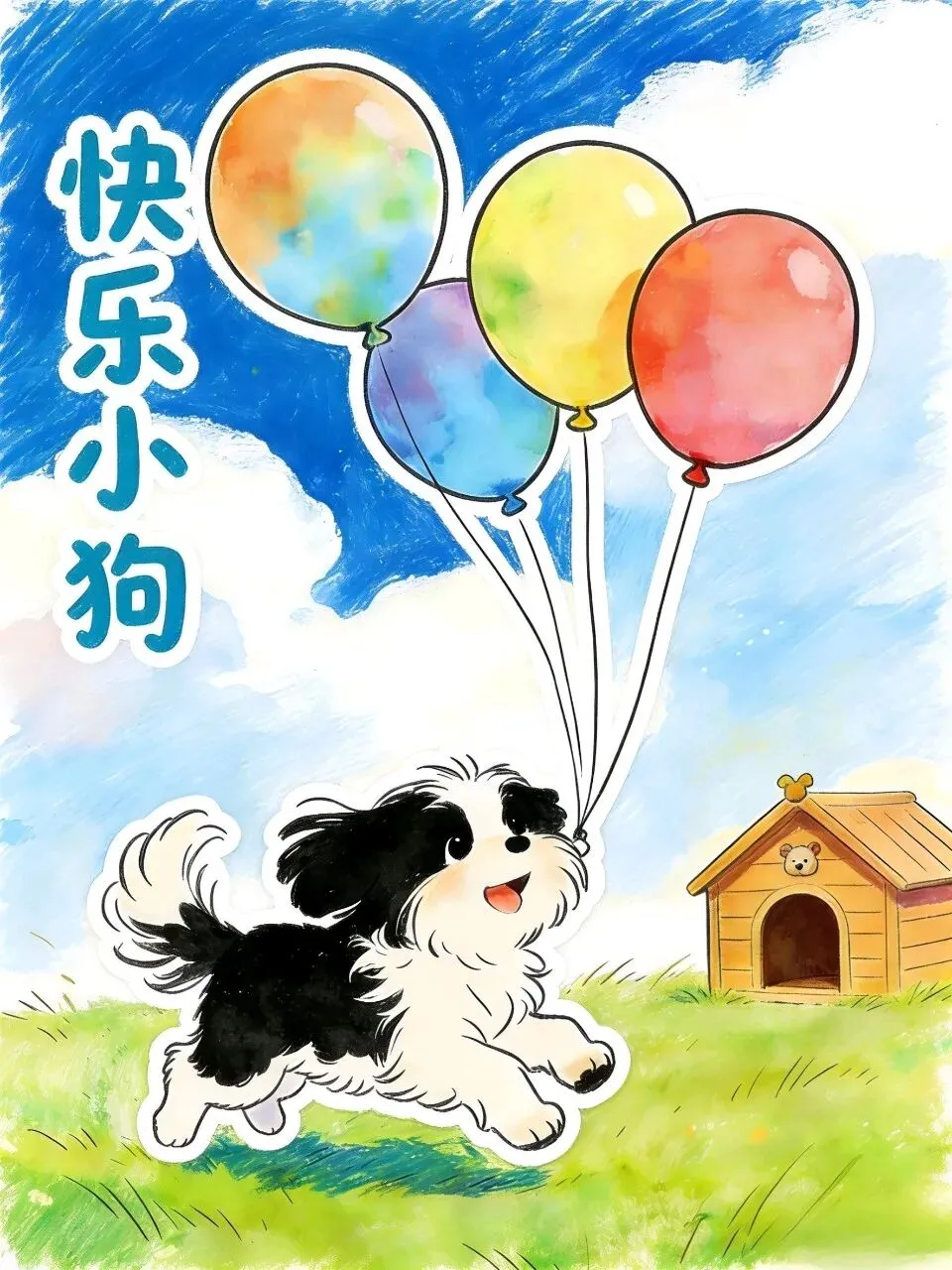 2. 讲述画面故事:“这只黑白小狗牵着彩色气球,在自家门前的草地上奔跑,阳光暖暖的,风轻轻吹着,它觉得特别开心!”