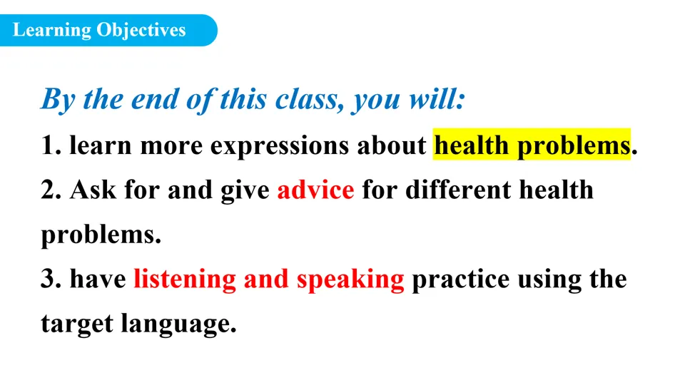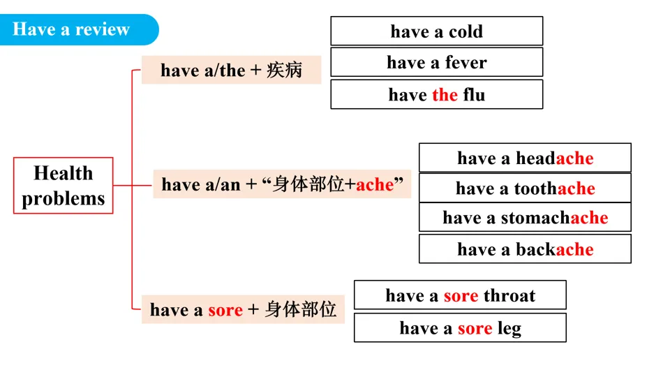 - 知识回顾:带领学生快速复习上节课所学的健康问题表达,如 have a cold 、 have a headache 、 have a sore throat 等,巩固病症类核心短语。
