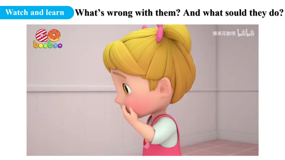 - 视频导入:播放一段“看医生”主题的动画短视频,提问 What's wrong with them? And what should they do? ,引导学生带着问题观看,并记录至少1个病症和对应的建议。