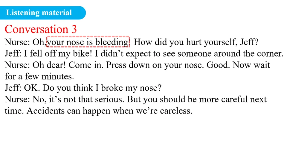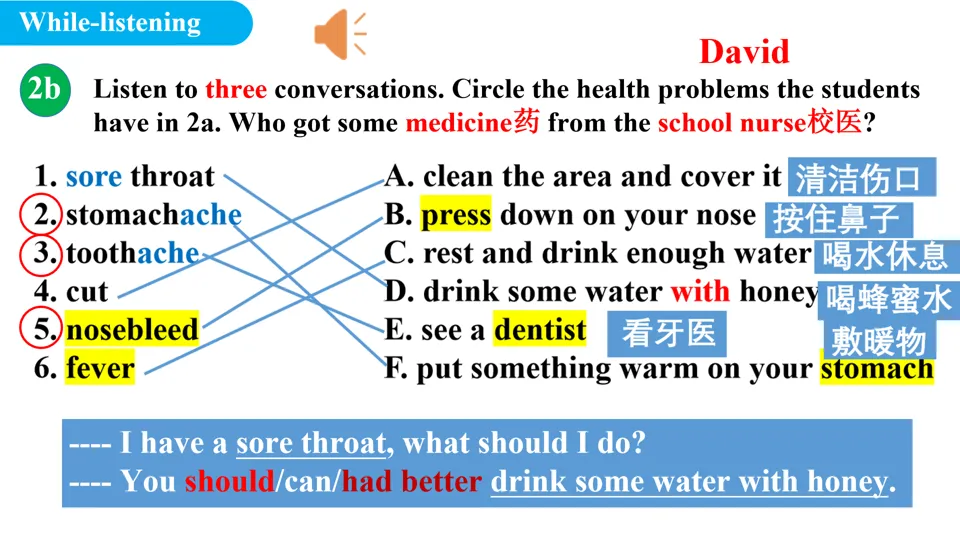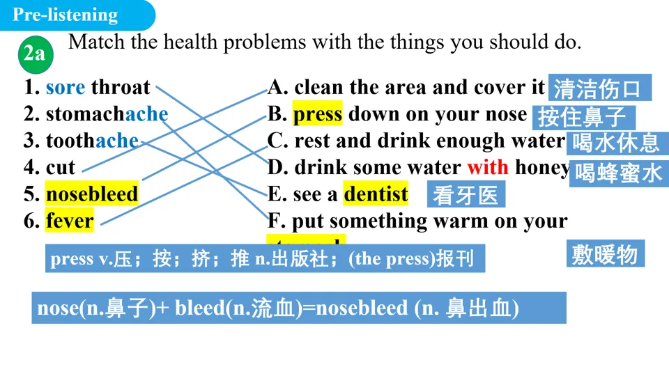 - 重点讲解 2a 中的核心词汇与短语: nosebleed (流鼻血)、 toothache (牙痛)、 press (按压)等,结合图片/动作演示帮助学生理解词义。