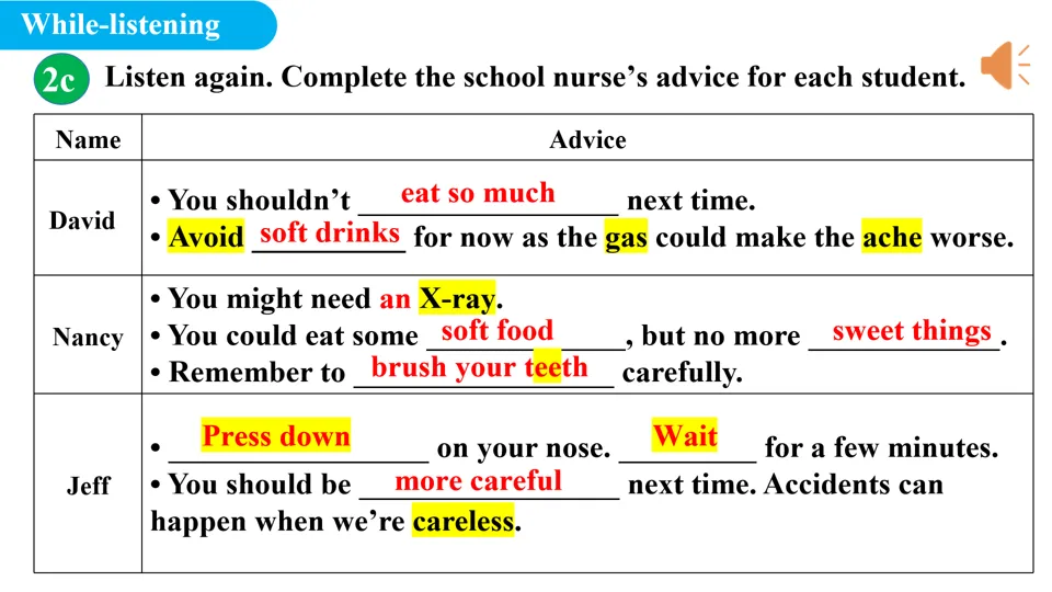 - 再次播放音频,引导学生完成 2c 表格填空,补全不同人物的健康建议。
