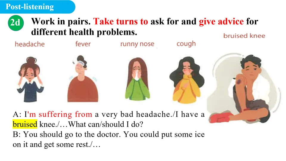 - 组织学生两人一组,轮流扮演“问诊者”和“建议者”,针对不同健康问题(如 bruised knee 、 cough 、 headache 等)进行对话练习。