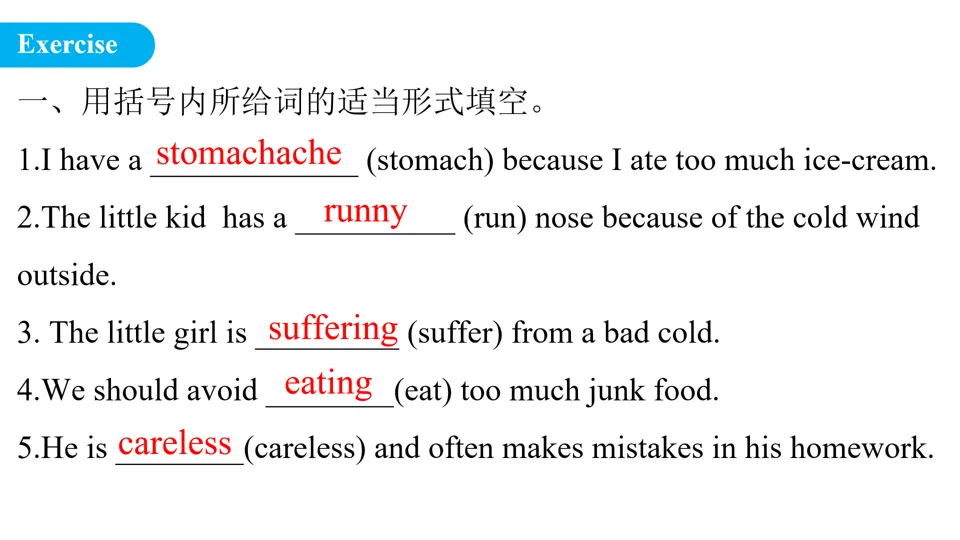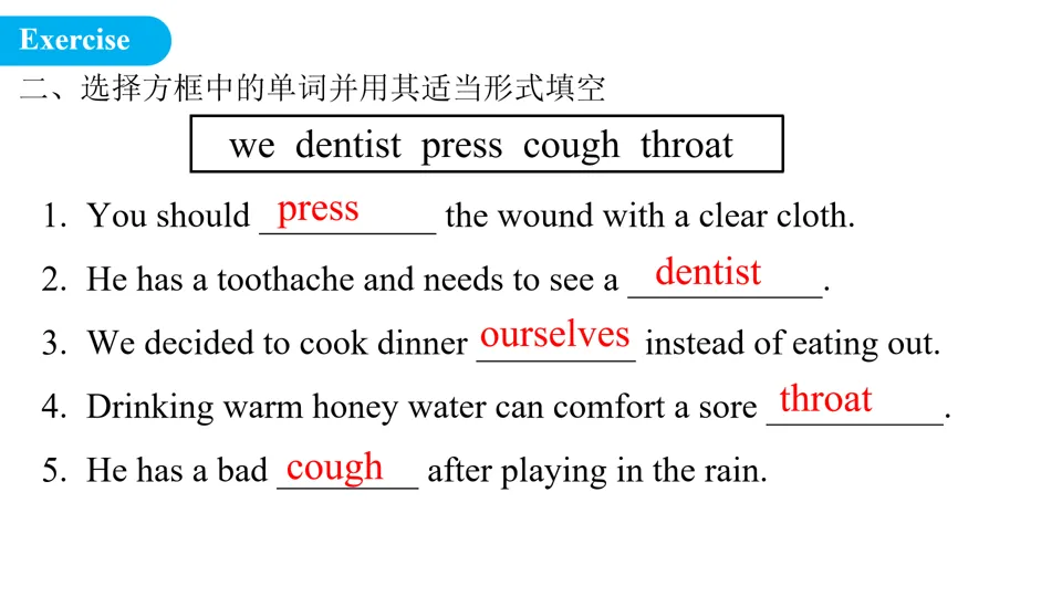 1. 抄写并背诵:本节课核心病症短语与建议句型,各3遍。