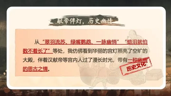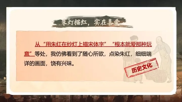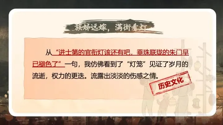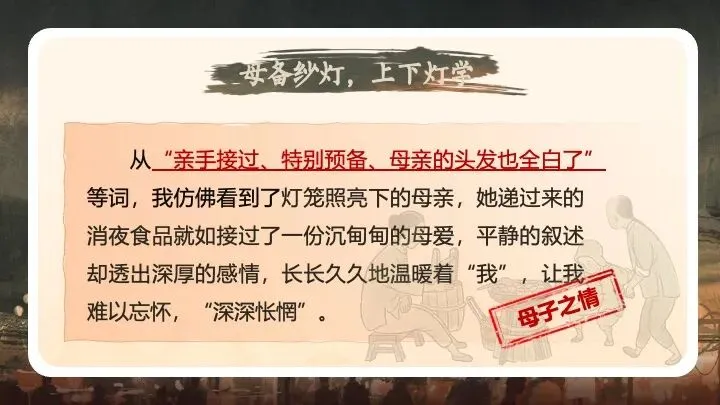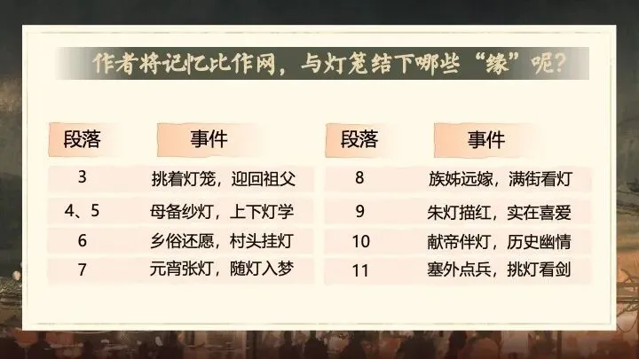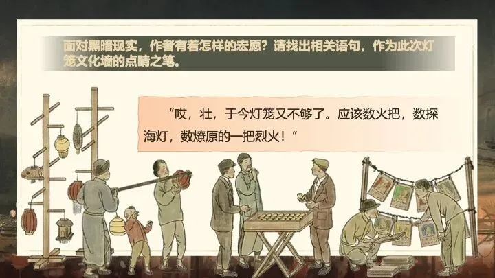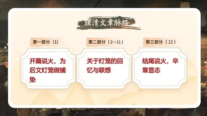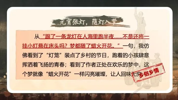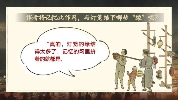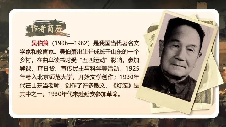 本篇课文以”灯笼”为题,回忆作者早年与灯笼相关的一些生活景象,流露出对故乡和亲人的怀念,并在结尾处结合当时的国运时事,表明要做抗日“马前卒”的心愿,传达出那个时代的“正能量”。学习这篇散文要注意分析文中多种表达方式的运用,认识文中“灯笼”的民俗意义、文化价值,品味、揣摩文中富有表现力的语言,体会作者对往昔生活和家国天下所寄予的复杂感情。