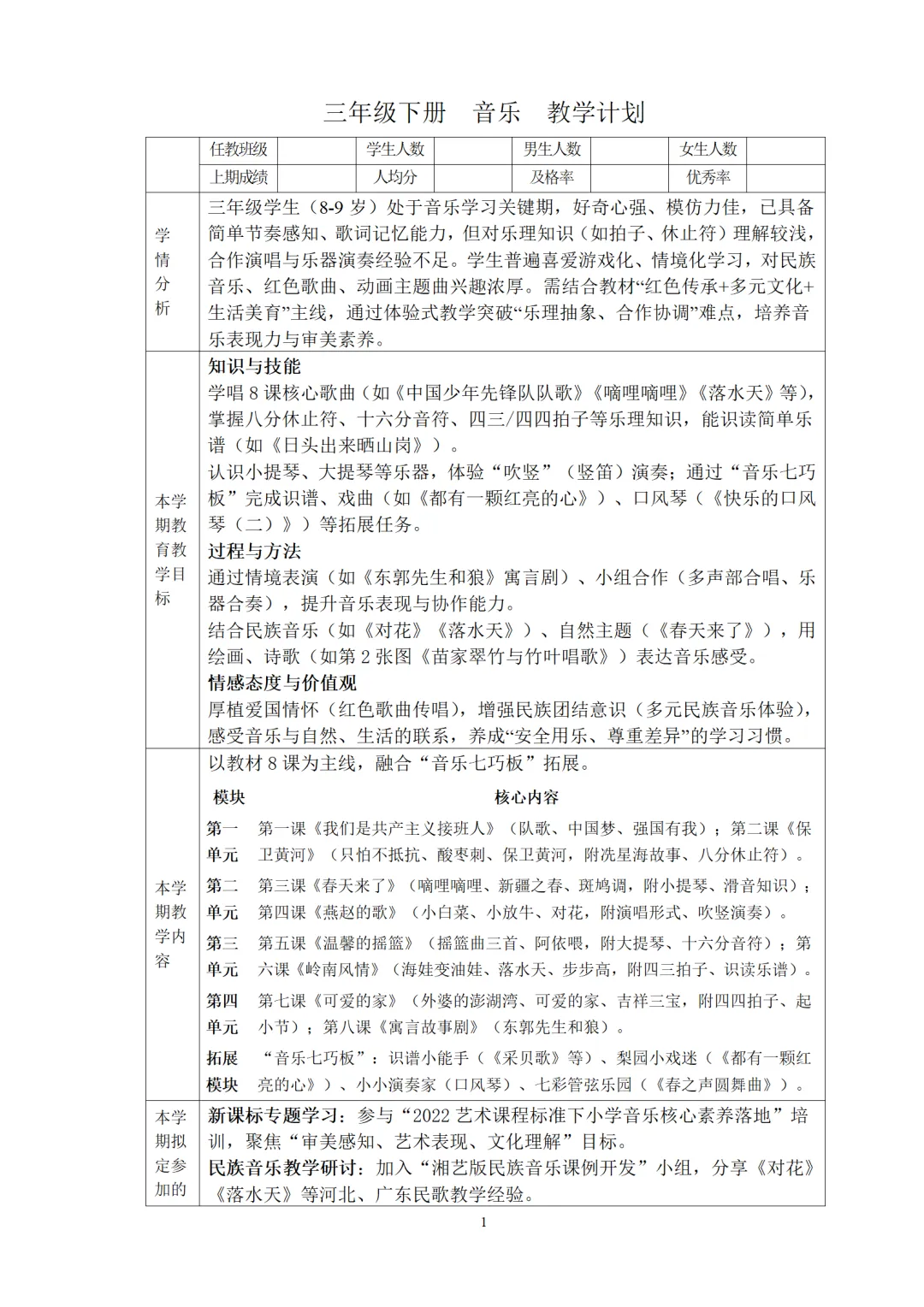 小学一至三年级的教材都有改动,湘艺版(2024年审定)小学音乐教案已经整理好。用户可扫码进来“夹子盘”付费购买电子版。或进微信小店“彩印店”直接购买纸质打印版。整理资料要花很长时间,适当收点辛苦费。根据新课标设置要求,每册有32节次左右。