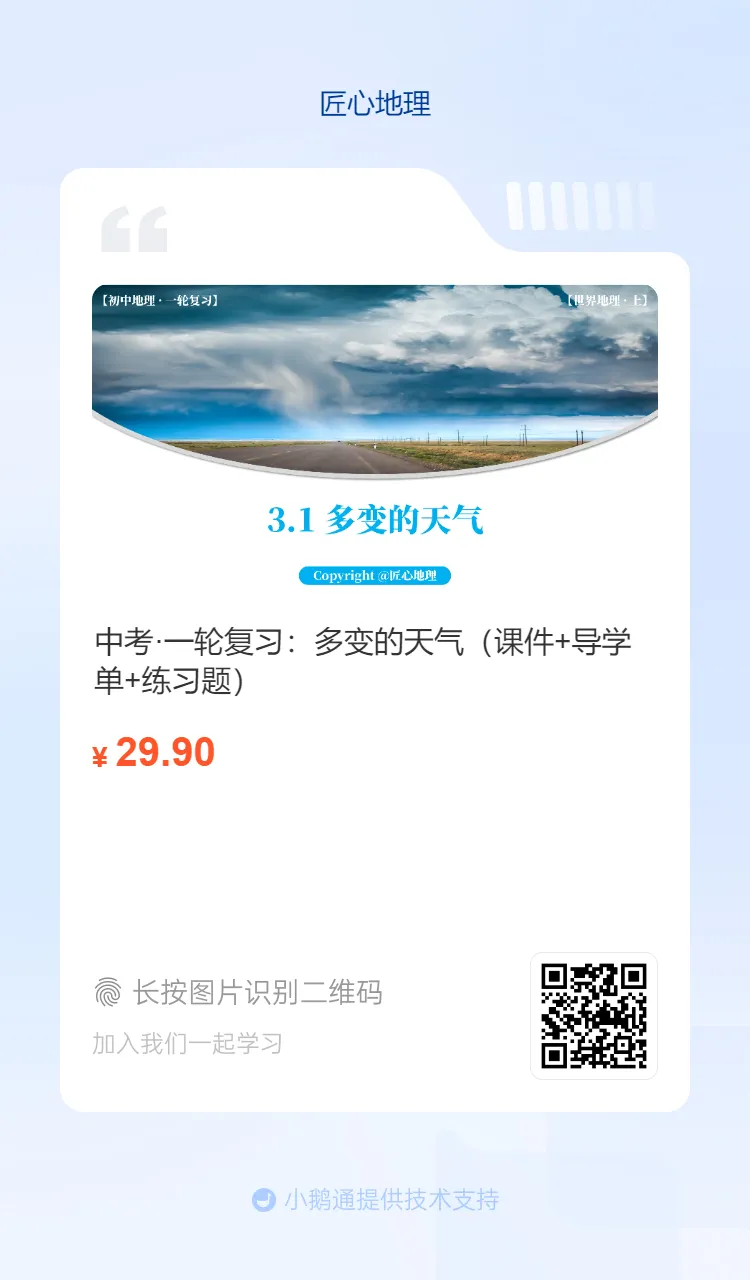 方式①:描下方二维码,获取新教材中考地理·一轮复习资料,含课件+导学单+练习题+送七八年级知识填图。(之前买过成套课件者,系统匹配优惠券,立减50)