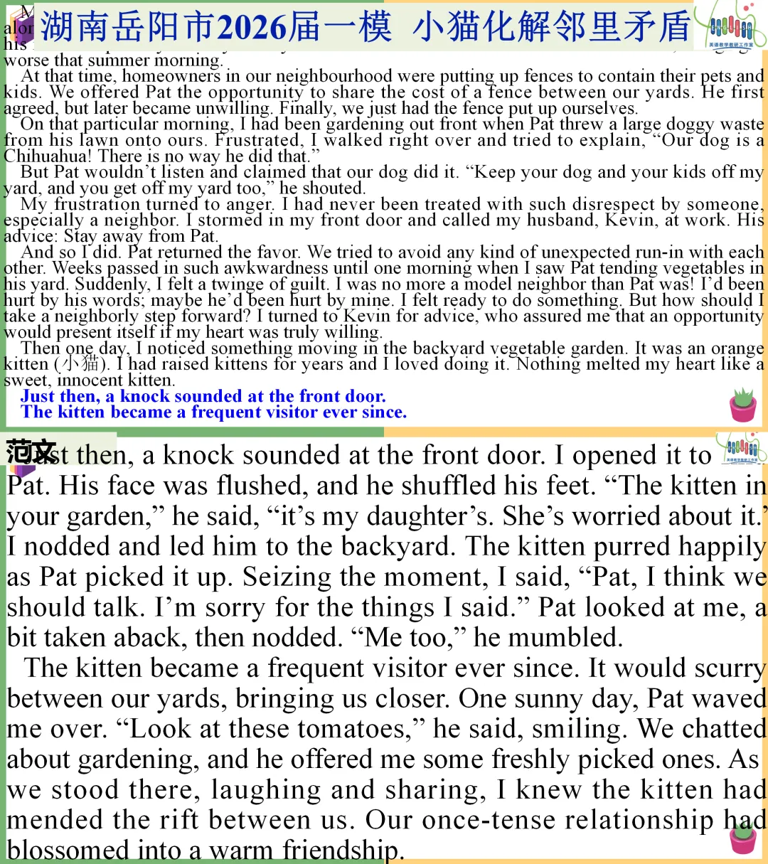 今日分享:2026届武汉二调续写:救小鸟打破邻里隔阂