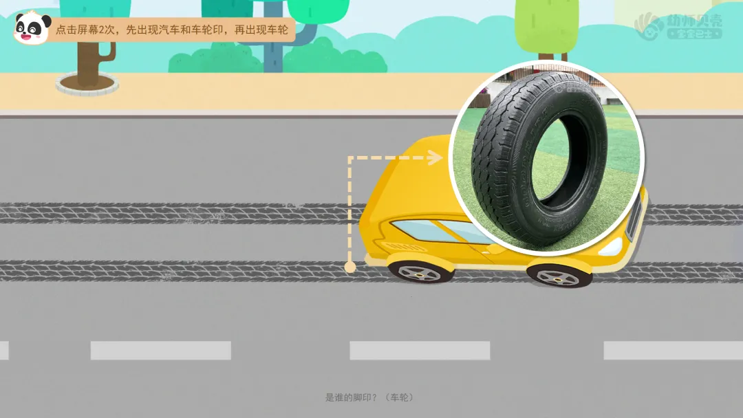 l出示图片“奇怪的脚印”、“车轮”,感知车轮花纹的不同。