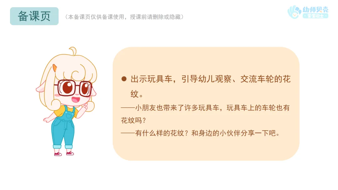 l出示玩具车,引导幼儿观察、交流车轮的花纹。