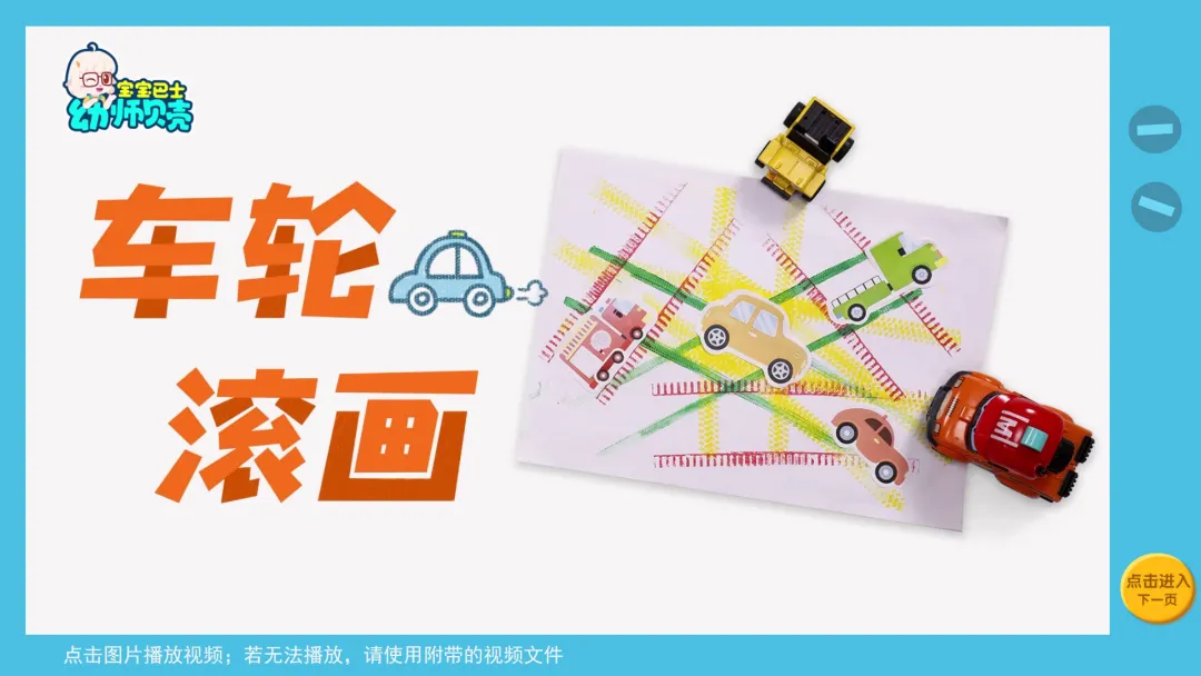 1.出示手工视频“车轮滚画”,引导幼儿初步了解车轮滚画的绘画过程。