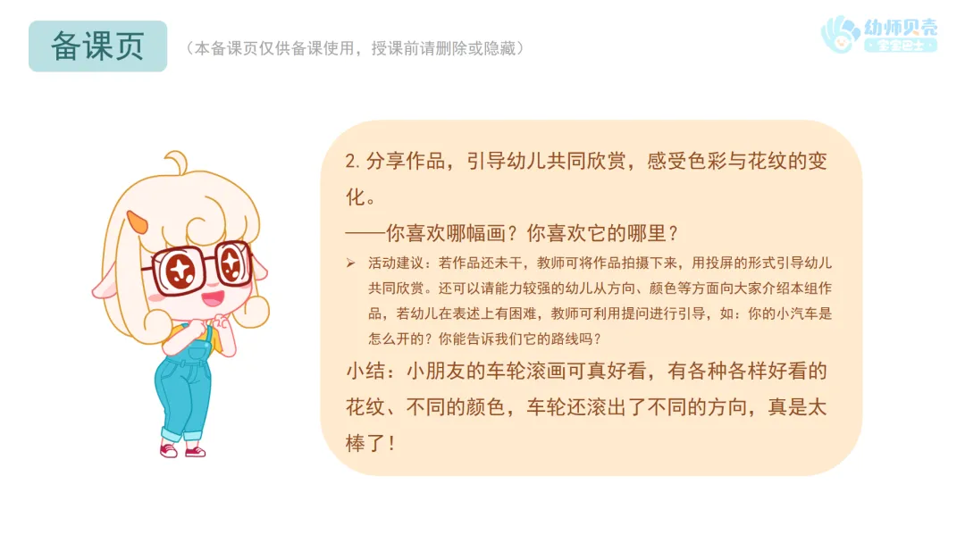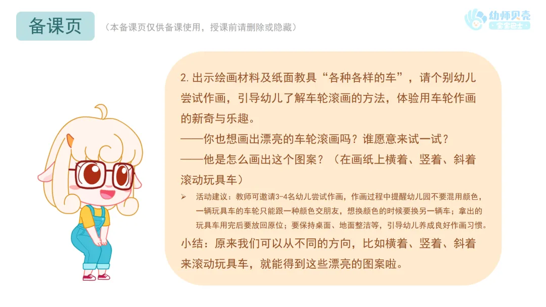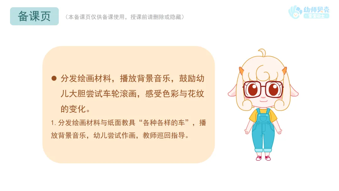 Ø活动建议:教师可邀请3-4名幼儿尝试作画,作画过程中提醒幼儿园不要混用颜色,一辆玩具车的车轮只能跟一种颜色交朋友,想换颜色的时候要换另一辆车;拿出的玩具车用完后要放回原位;要保持桌面、地面整洁等,引导幼儿养成良好作画习惯。
