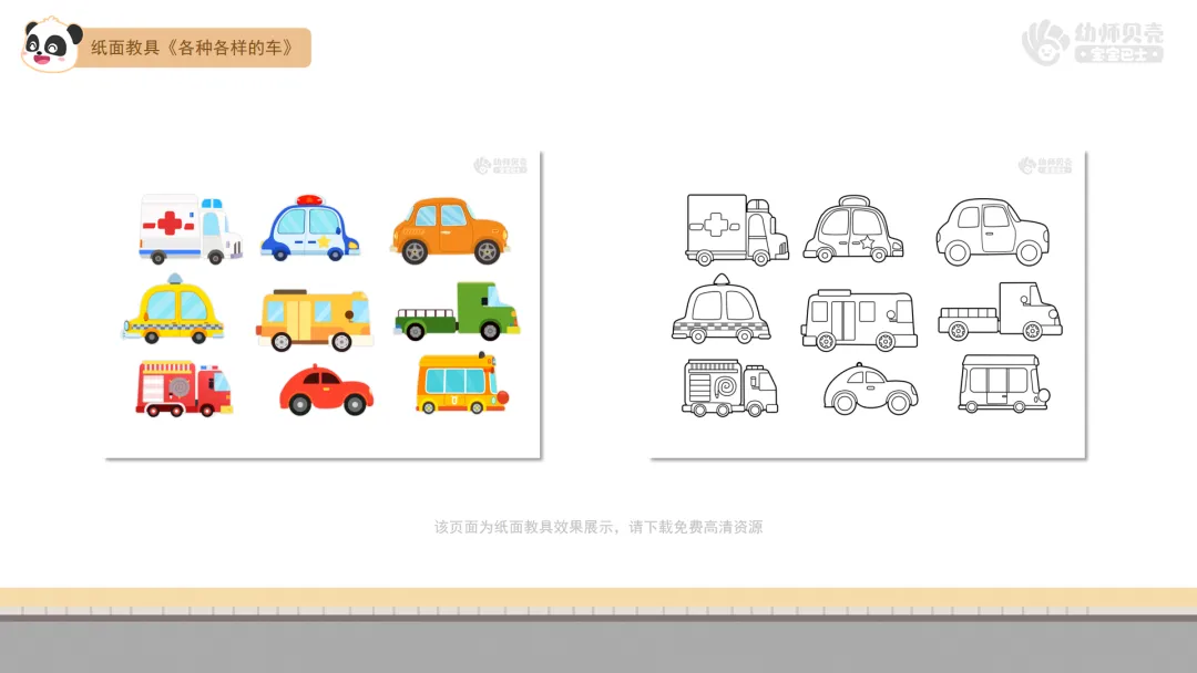 1.分发绘画材料与纸面教具“各种各样的车”,播放背景音乐,幼儿尝试作画,教师巡回指导。