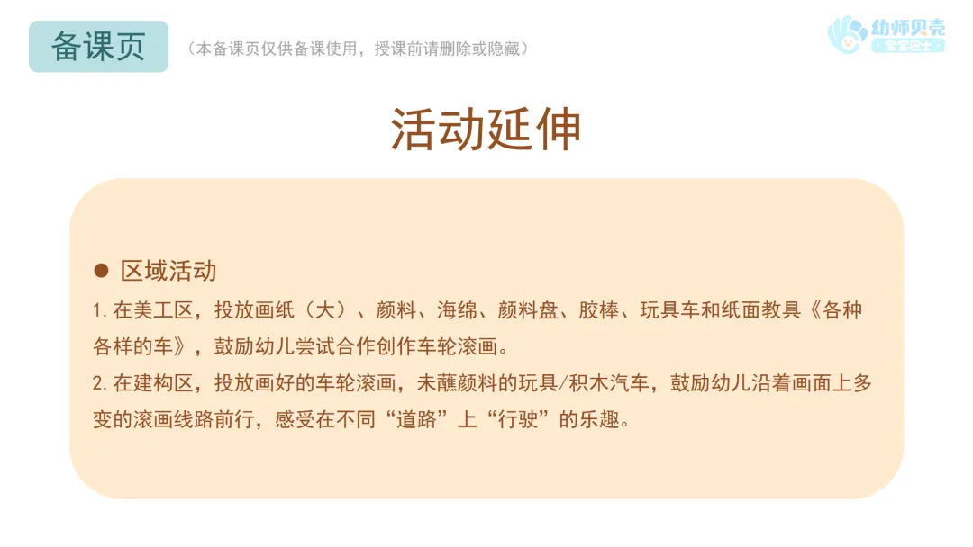 l教师可建议幼儿带多种类型的玩具车(四轮、两轮、独轮车等)来园,还可以选择较大且有清晰轮胎印的玩具车,丰富作品内容。