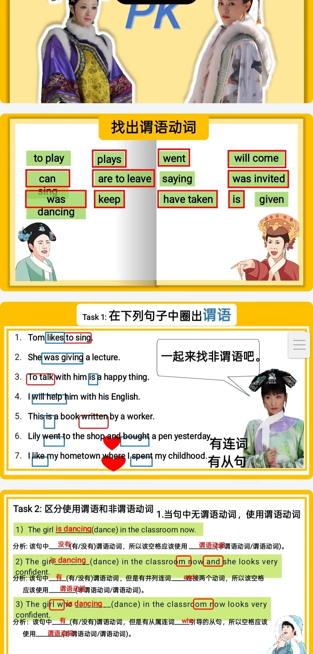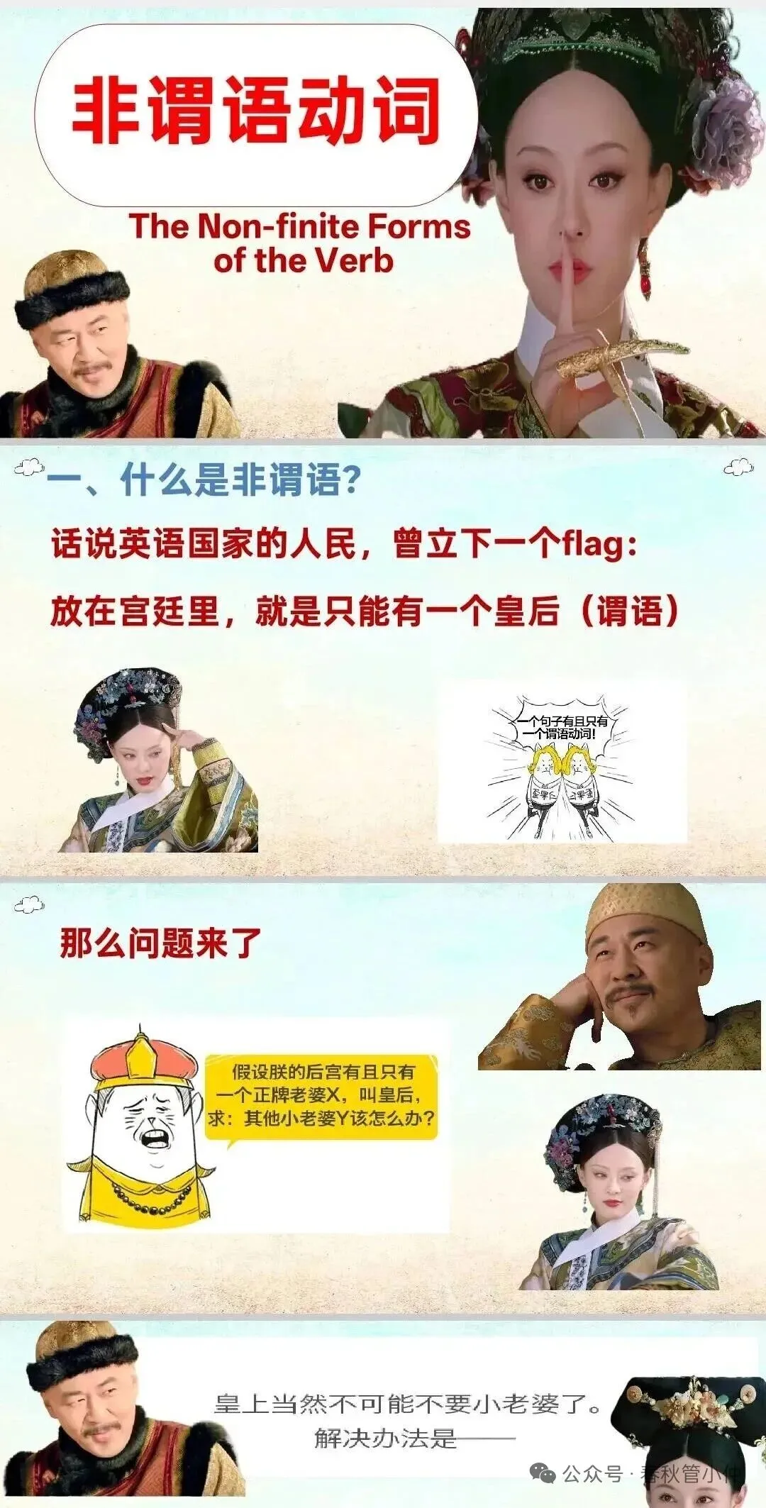 1.非谓语动词。《甄嬛传》与非谓语动词的结合,是近年来英语教学中的一种创新教学方式,通过将非谓语动词的概念与《甄嬛传》中的宫廷关系进行类比,帮助学生更直观地理解非谓语动词的用法和功能。