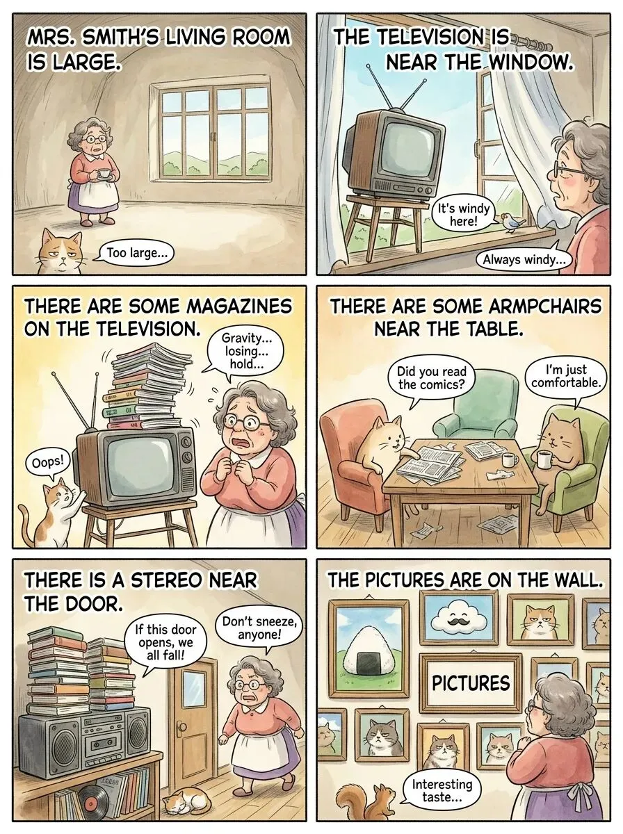 B. 多类型拓展阅读1. 现代场景故事 (Modern Scene Story)Welcome to my smart living room! It looks quite different from Mrs. Smith's. There is a huge flat-screen TV on the wall, but it's not just for watching shows. It's connected to the internet. There are no magazines or newspapers on the table. Instead, there is a tablet computer. My family reads news and books on it. There aren't any CDs or books near the stereo because our music comes from online streaming services. The most important thing in the room? There are charging ports everywhere! Our phones, tablets, and laptops are always near a plug. It's a room designed for digital life.引导性问题:How is the writer's living room different from Mrs. Smith's in terms of technology use?2. 文化背景小知识 (Cultural Background)In many British homes, the "living room" or "sitting room" is the heart of the house. It's where families relax, watch television, and entertain close friends. Traditionally, it might have a fireplace as a focal point. The arrangement in Mrs. Smith's room---armchairs near a table---is typical for a "conversation area." Having books and magazines around is also common, reflecting a culture of reading. Interestingly, the "stereo" (now often a hi-fi or sound system) shows the importance of music. In contrast, the formal "parlour" or "drawing room" was used for receiving guests in the past, but this is less common now.引导性问题:According to the text, what was the traditional purpose of a "parlour," and how is it different from a modern living room?3. 今昔对比 (Then and Now Contrast)My grandmother's living room in the 1970s and mine today are like two different worlds. In her old photos, there is a large, heavy television in a wooden cabinet. There are big, patterned armchairs and a thick carpet. On the shelves, there are many books and a record player with vinyl records. Now, in my apartment, there is a slim TV hanging on a plain wall. There is a small, modern sofa and a minimalist table. There are no shelves; all my music and books are in a small computer or on my phone. Her room was full of things; my room is full of space and light. Both are comfortable, but they speak different languages of design.引导性问题:What is the main difference in how music is stored and played between the grandmother's room and the writer's room?4. 新潮英语改写 (Trendy English Rewrite)Okay, so check out this living space. It's totally massive. Right? So, there's this awesome TV setup, kinda by the window for the natural light vibe. On top of it, you've got a couple of mags---you know, for casual browsing. Dead center of the room, there's this chic table. A few newspapers are just lying there, giving that "lived-in" feel. And the armchairs? They're pulled up close to the table, perfect for hanging out. Oh, and by the door, there's a cool vintage stereo system. It's got a stack of books on it, which is a major mood. The walls? They're not bare---there's some proper art up there. Overall, it's a super chill spot.引导性问题:How does the language in this rewrite make the description feel more informal and modern compared to the original text?5. 难度略高的拓展阅读 (Slightly Higher Difficulty)The concept of a designated "living room" is itself an interesting social construct. It presupposes a separation between private and semi-public spaces within a home. Mrs. Smith's living room, as described, functions as a microcosm of middle-class domesticity in its era. The presence of a television indicates access to mass media; the newspapers suggest a engagement with current affairs; the books and stereo point to cultural consumption. The arrangement---furniture oriented towards a central table and the TV---hints at both social interaction (conversation) and passive reception (watching). This single room, therefore, is not just a physical space but a reflection of specific lifestyle choices and social norms of its time.引导性问题:What does the author suggest a living room can reflect beyond just being a physical space?6. 简单科普或趣闻 (Simple Science or Trivia)Have you ever wondered why we say "There is" and "There are"? It's all about agreement. In many languages, the verb must match the subject. "There" isn't the real subject; the thing that exists is. So, we say "There is a cat" (one cat) and "There are two cats" (more than one). It's like a team sport: the verb (is/are) always wears the same "number jersey" as the main player (the subject). This rule helps keep sentences clear. Even native speakers sometimes make mistakes with tricky subjects, like "There's a lot of people here" (informal) instead of the grammatically strict "There are a lot of people here."引导性问题:According to this text, what is the real subject in a "There is/are" sentence, and why is verb agreement important?
