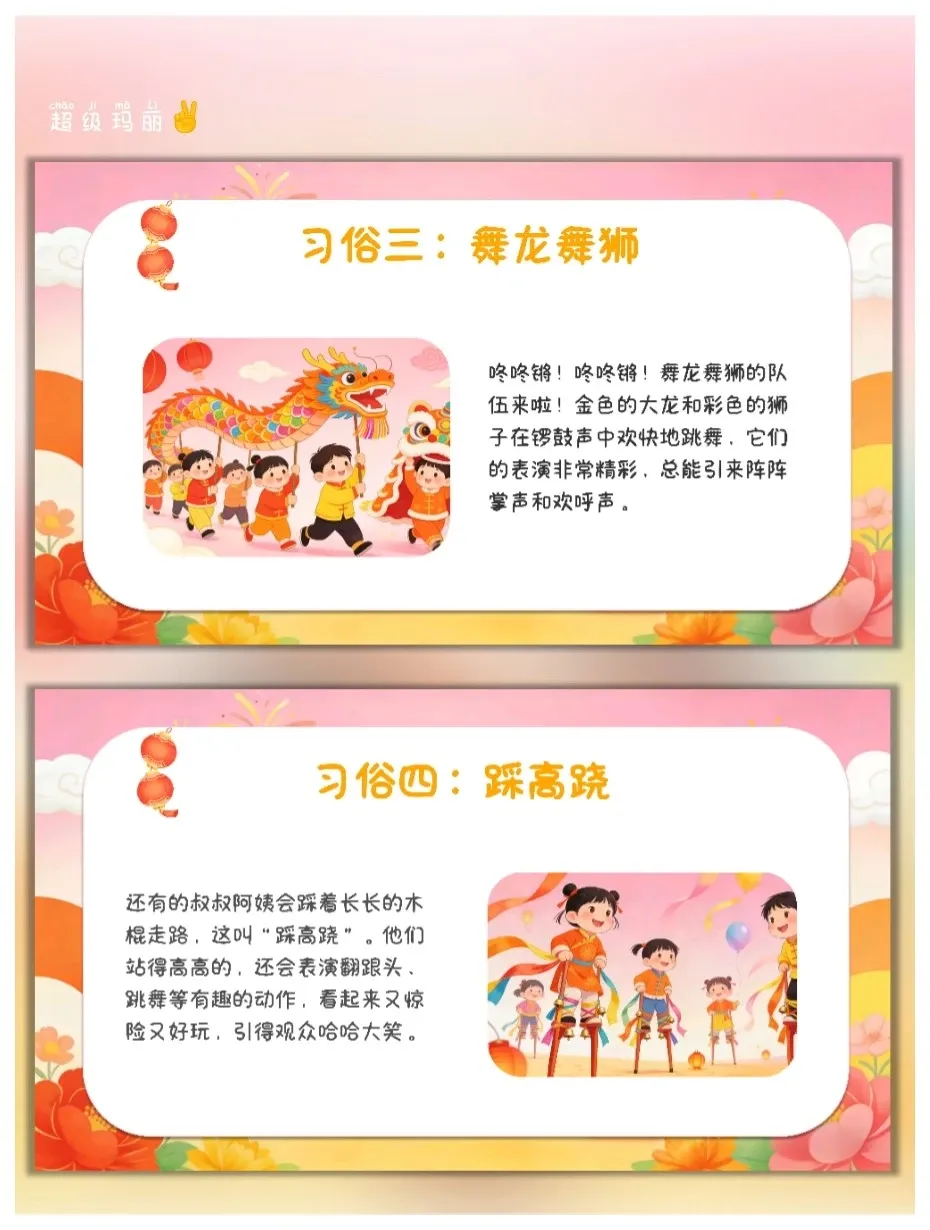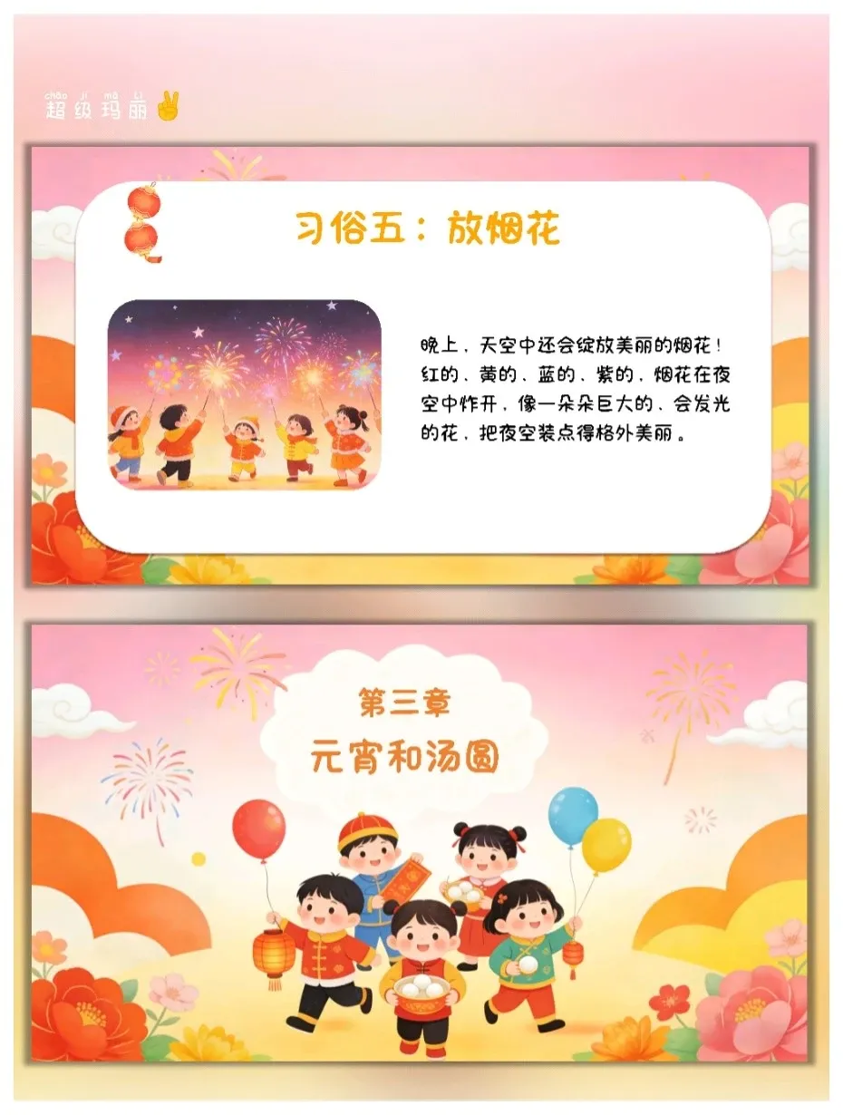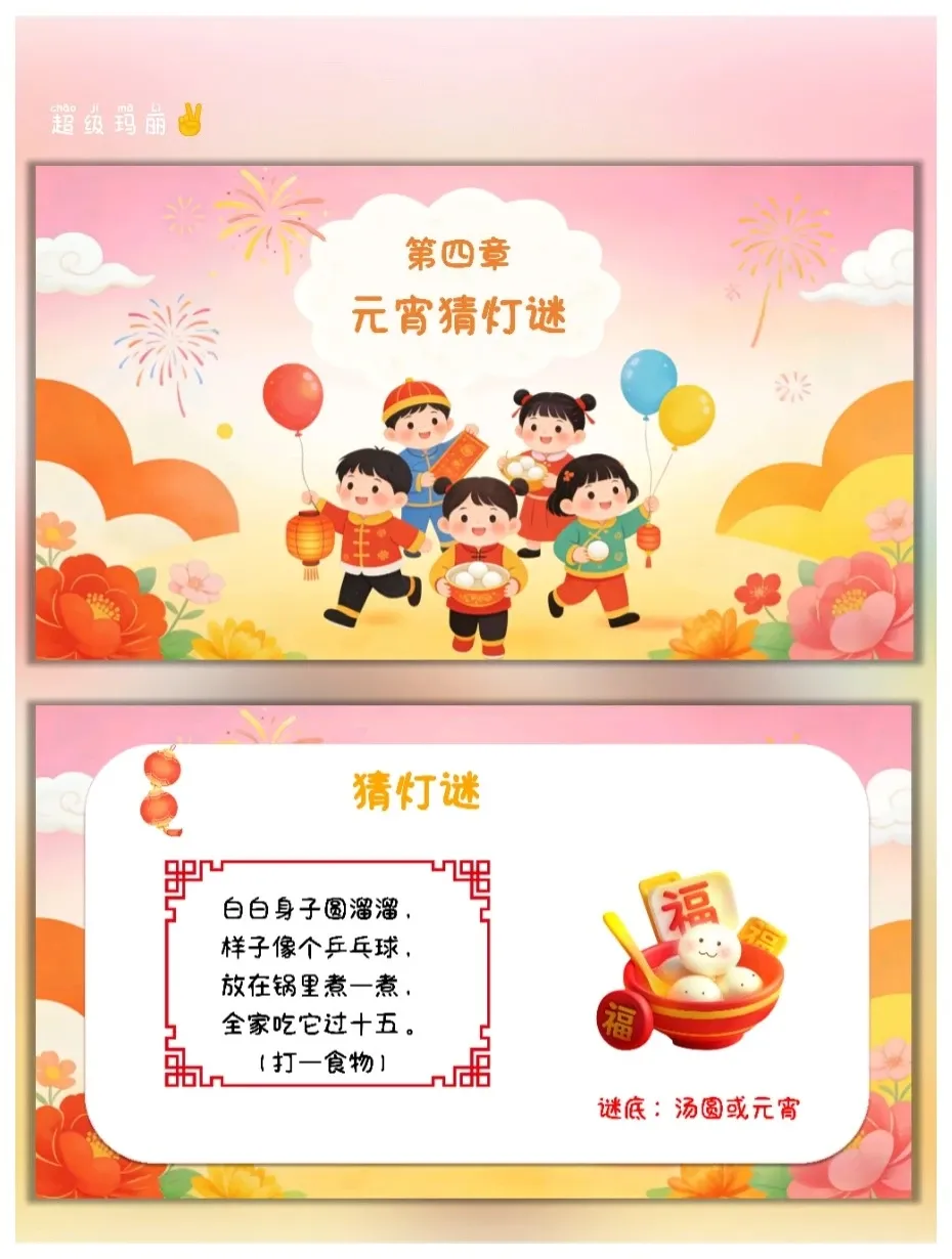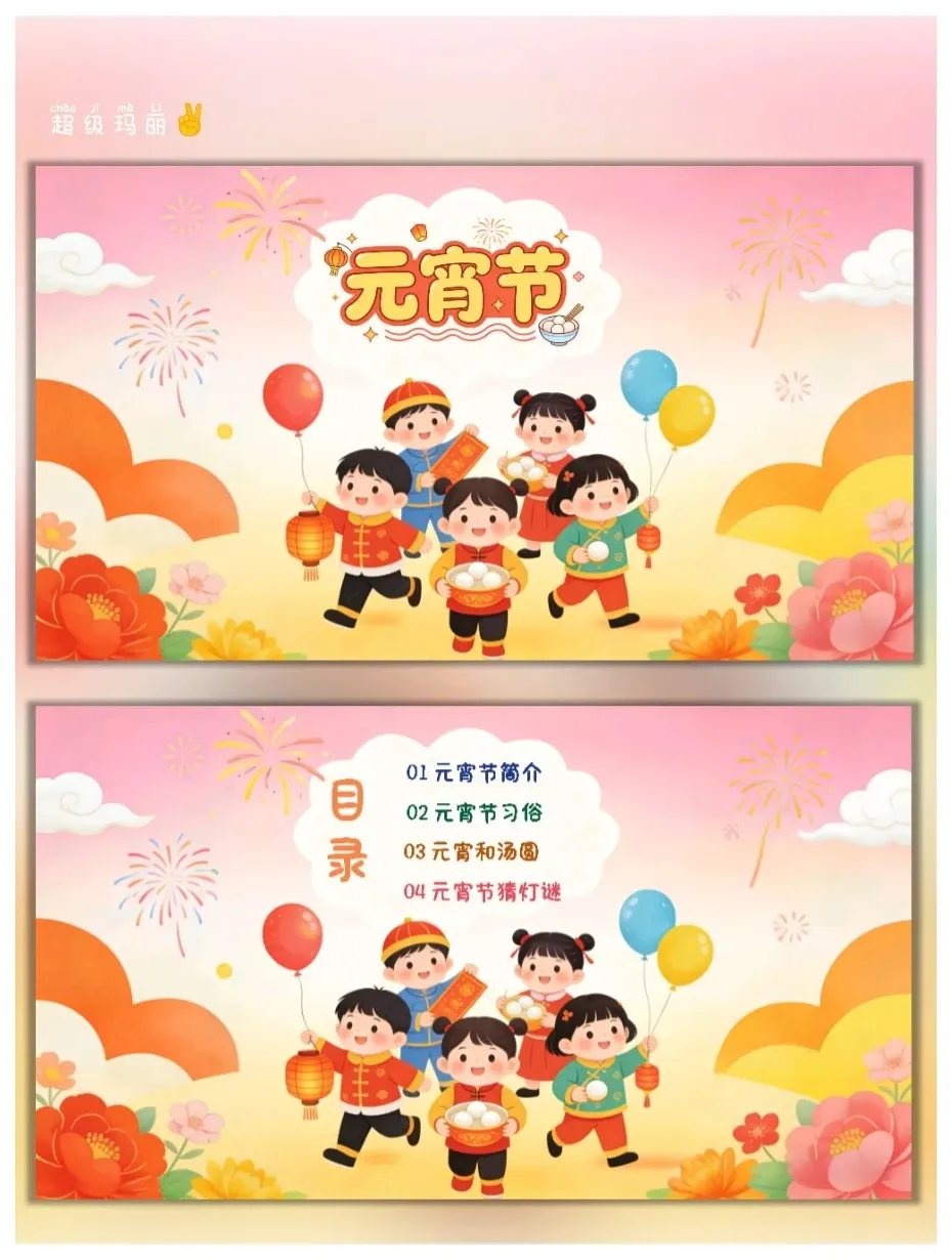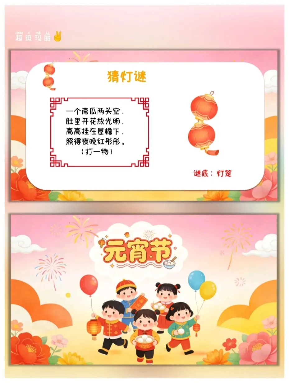 元宵节是我国传统民俗节日,承载着团圆、喜庆的文化内涵,也是幼儿感受中华传统文化的重要载体。本次活动结合PPT中的元宵节知识,以趣味化、游戏化的形式,让幼儿了解元宵节的由来、习俗,区分元宵和汤圆的不同,通过猜灯谜、看插画等互动环节,激发幼儿对传统节日的喜爱,培养幼儿的观察力、表达力和动手感知能力,让幼儿在轻松愉快的氛围中感受元宵节的欢乐与温暖。 活动目标 认知目标:知道元宵节是农历正月十五,了解元宵节的别称(上元节、灯节),熟悉闹花灯、猜灯谜、舞龙舞狮等主要习俗,能区分元宵和汤圆的制作方法、口感差异。
