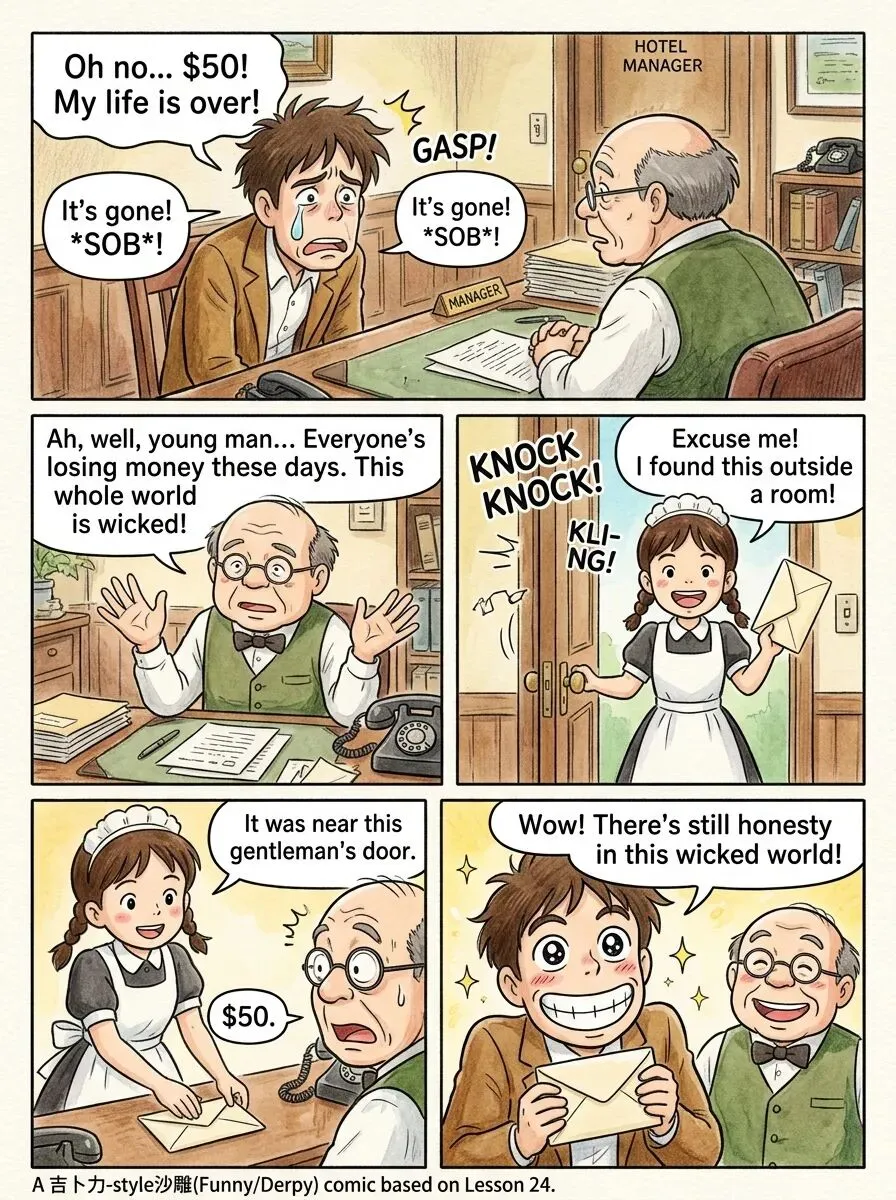 我走进饭店经理的办公室,坐了下来。我刚刚丢了50英镑,感到非常烦恼。"我把钱放在房间里了,"我说,"可现在不见了。"经理深表同情,但却无能为力。"现在大家都在丢钱,"他说。他开始抱怨起这个邪恶的世道来,却被一阵敲门声打断了。一个姑娘走了进来,把一个信封放在了他桌上。里面装着50英镑。"这是我在这位先生的房门外找到的,"她说。"嗯,"我对经理说,"这世界上还是有诚实可言的!"