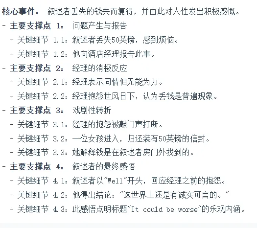 ③ 分析作者态度: 叙述者(作者代言人)的态度经历了一个变化:从开始的烦恼 (upset),到听完经理抱怨后的无奈或认同(未明说,但语境暗示),最后在钱失而复得后转为一种温和的、带点讽刺的乐观 (Well,... there is still some honesty in this world!)。作者通过这个短小的故事,传达了一种"事情可能没有看起来那么糟"、"人性中仍有闪光点"的积极态度,这与标题"It could be worse"完美呼应。