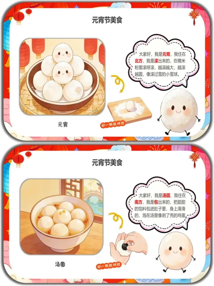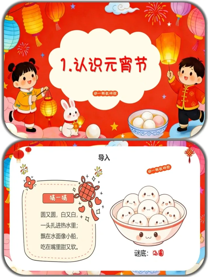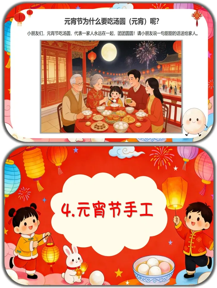 一、设计意图 本活动以幼儿熟悉的“汤圆”为切入点,通过谜语导入、习俗体验、美食对比、手工制作等生动有趣的环节,引导幼儿在“玩中学、做中悟”,了解元宵节的时间、习俗和美食,感受“团圆”的美好含义。 活动将认知发展与情感教育有机结合,既让幼儿在猜灯谜、模仿表演、手工制作中体验传统节日的欢乐氛围,又通过“元宵vs汤圆”的南北对比拓宽文化视野,最终落脚于“说甜甜的话送给家人”的情感表达,让幼儿在了解传统节日的同时,学会爱家人、爱生活,实现认知、情感、能力的全面发展。