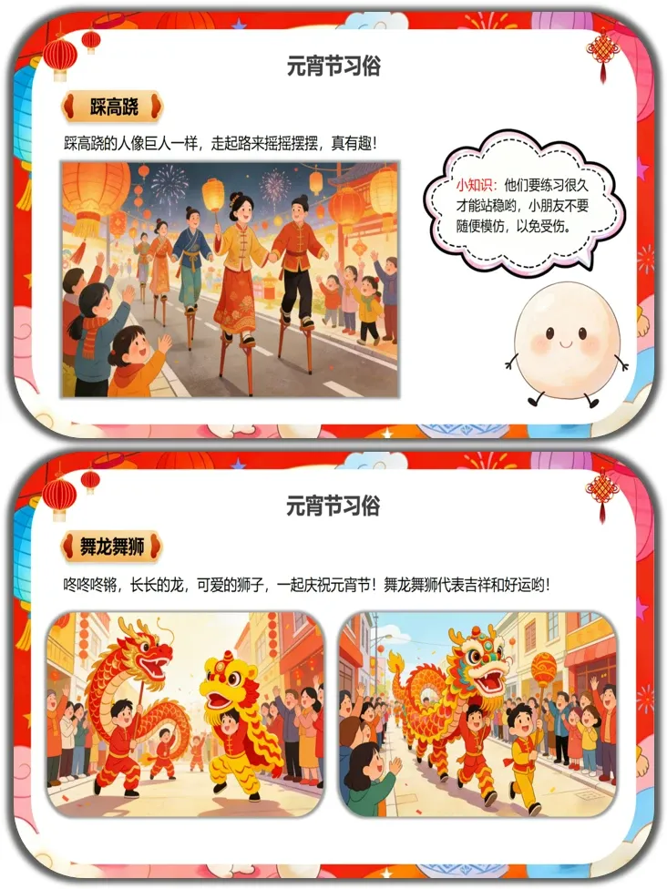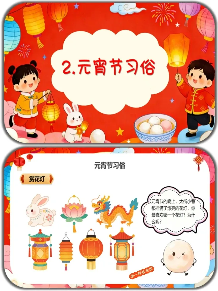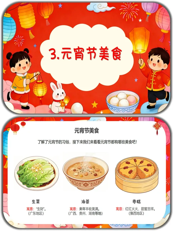 认知目标:知道元宵节是农历正月十五,又称上元节、灯节,了解元宵节的核心习俗和特色美食。