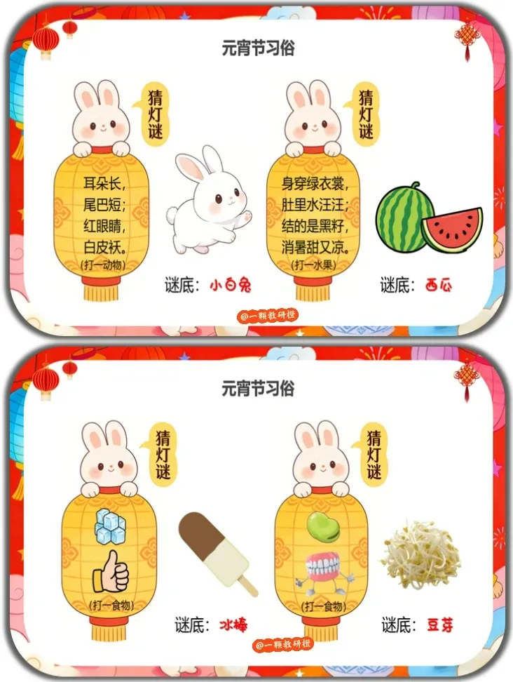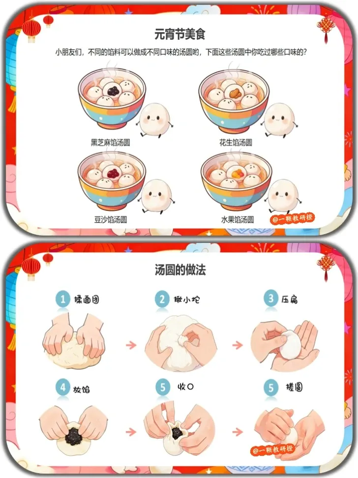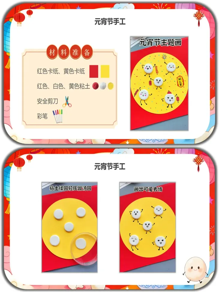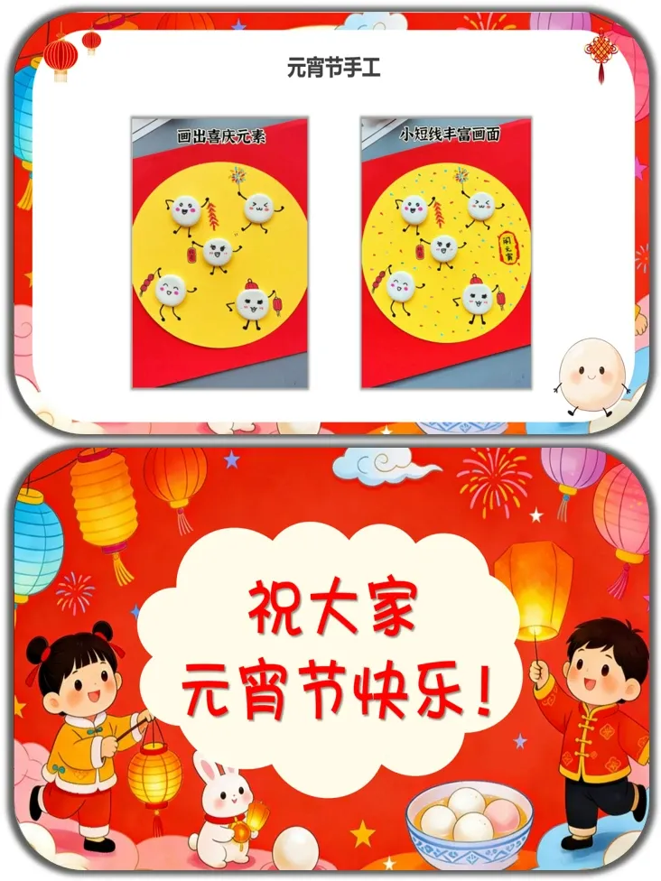 技能目标:能参与猜灯谜、做元宵手工等活动,尝试简单描述汤圆的制作过程,锻炼动手和表达能力。