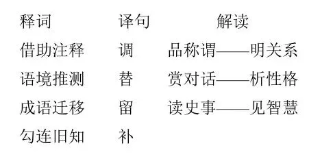 基于对编者意图的上述分析,本课在教学设计时抓了两个要点:一是结合单元要求学习精读的阅读方法;二是结合本文特点体会劝说艺术。前提是先解决文言文的基本词句问题。