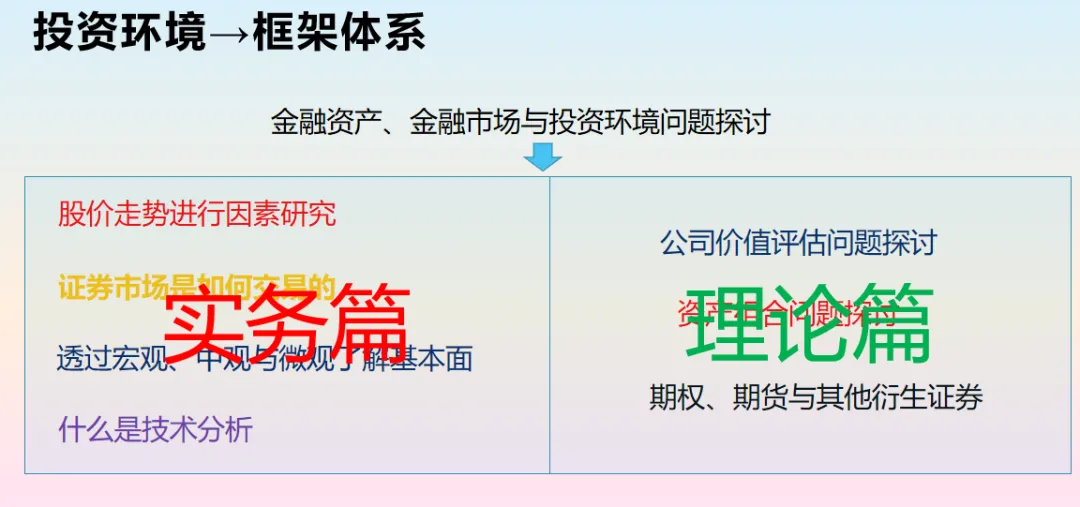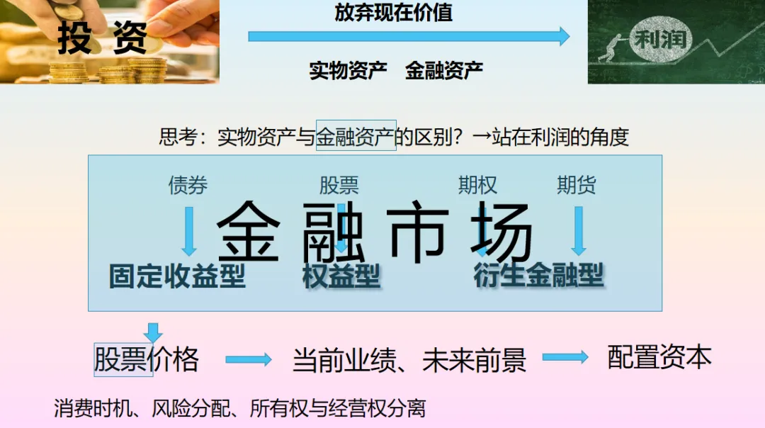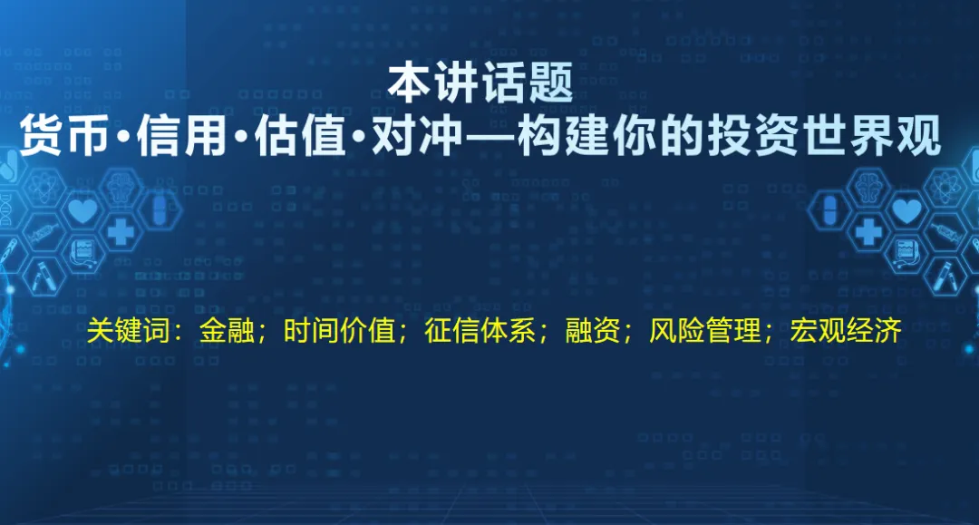 本课程为微专业课程《金融与投资原理》第一讲:货币·信用·估值·对冲——构建你的投资世界观本讲围绕货币、信用、利率、金融市场、货币供求与货币政策、证券市场分析、证券估值、投资组合、金融衍生工具套期保值等问题进行讲解。对课程进行整体认知。金融→货币→时间价值→利率与收益率→债券、股票→金融机构(金融工具)→金融市场→实体经济(货币供求)→货币政策